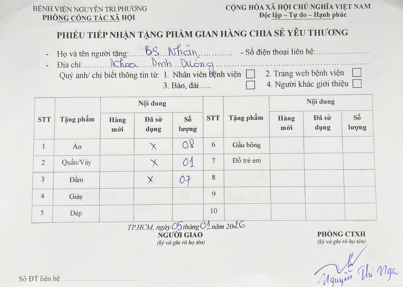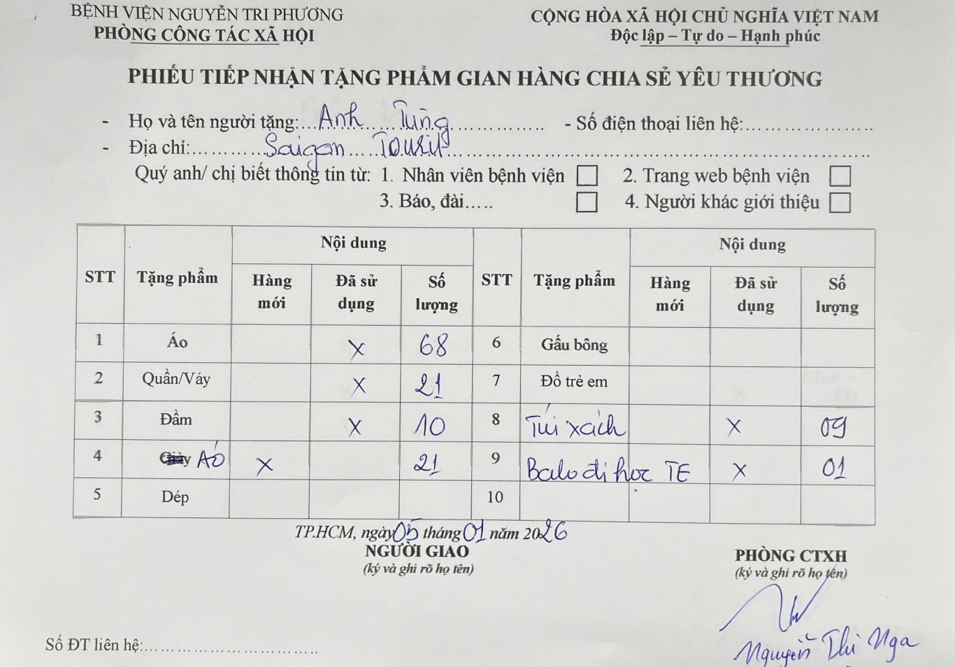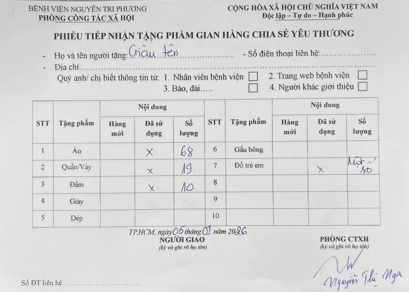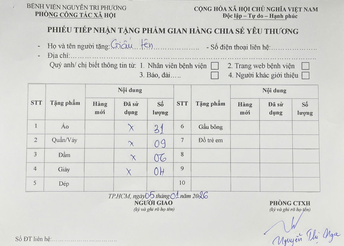 THÔNG TIN TIẾP NHẬN TẶNG PHẨM GIAN HÀNG CHIA SẺ YÊU THƯƠNG NGÀY 05/01/2026