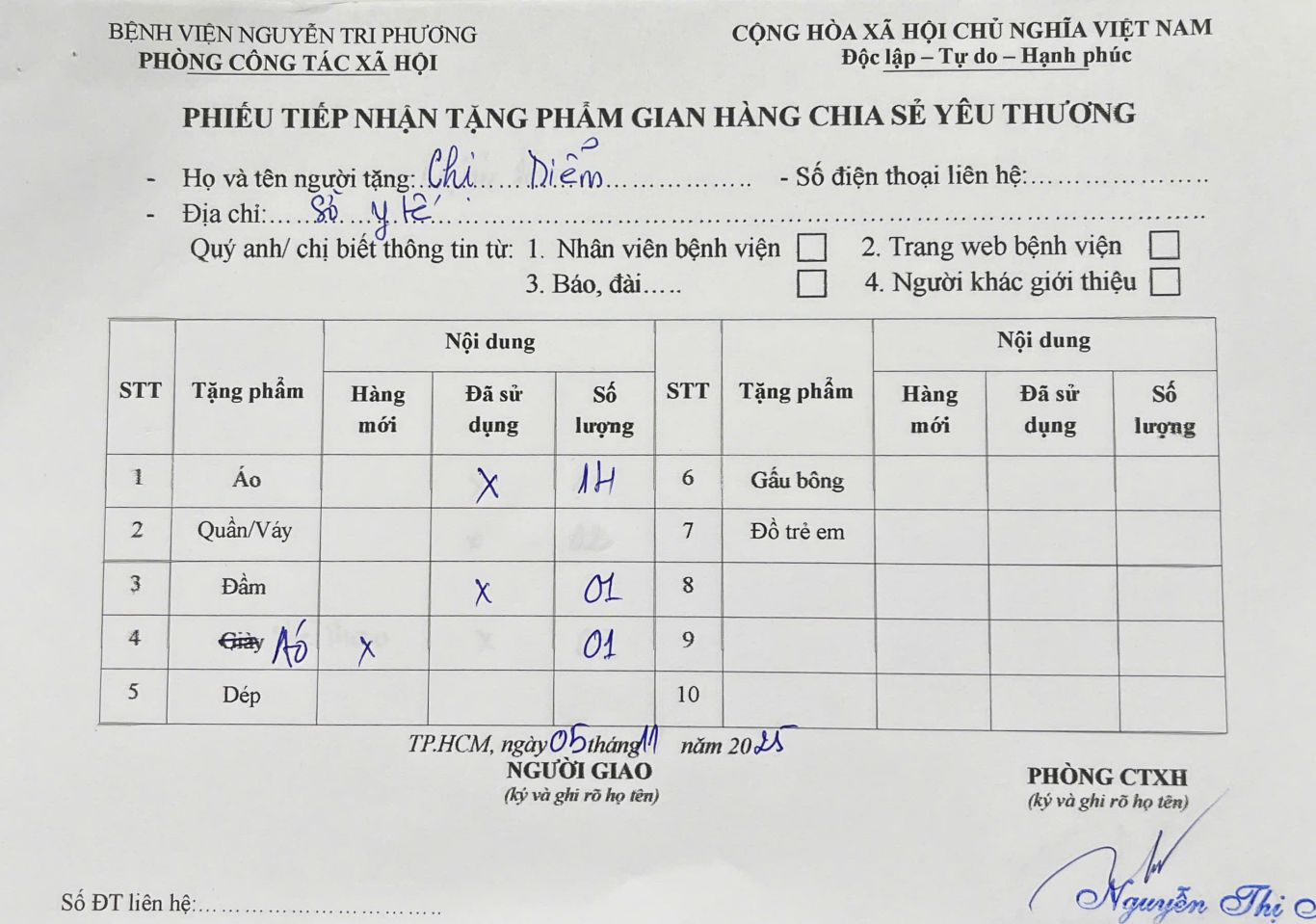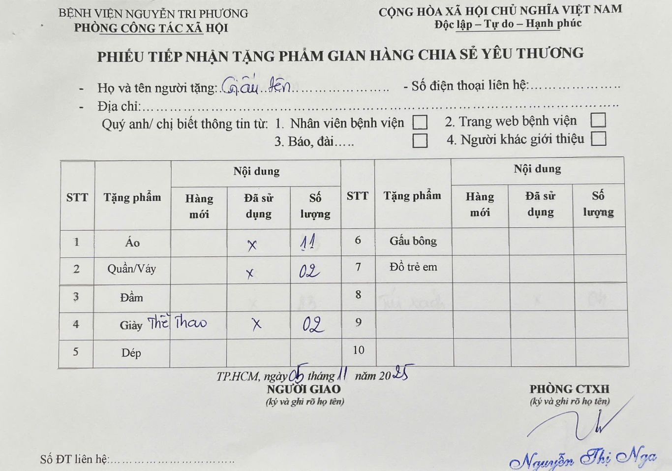 Thông tin tiếp nhận tặng phẩm gian hàng Chia sẻ Yêu thương ngày 05/11/2025: