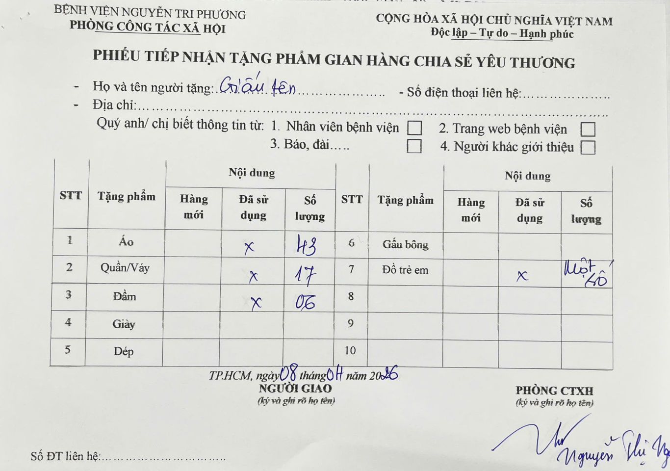 Thông tin tiếp nhận tặng phẩm gian hàng Chia sẻ Yêu thương ngày 08/04/2026: