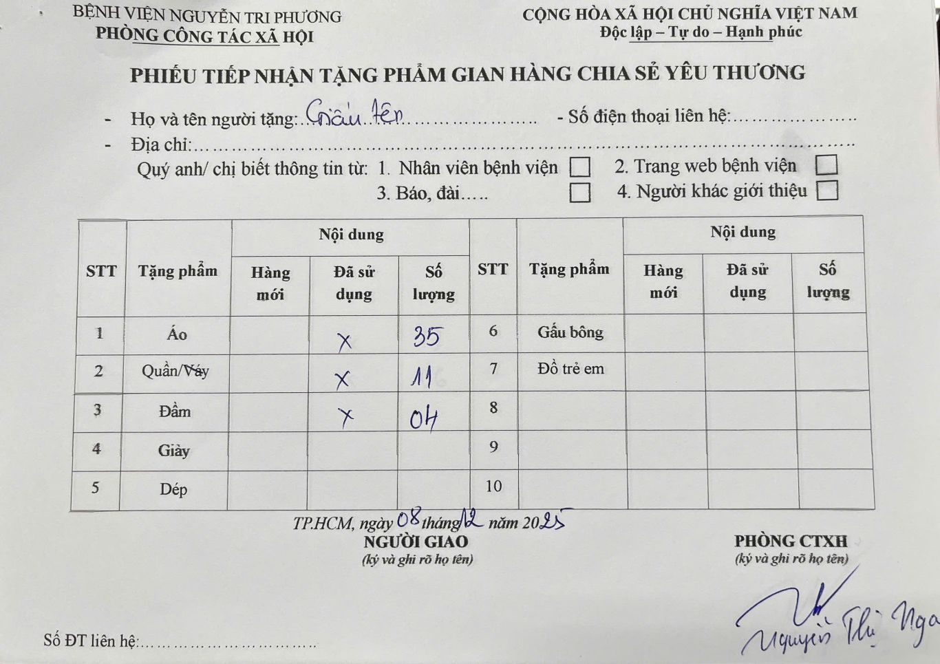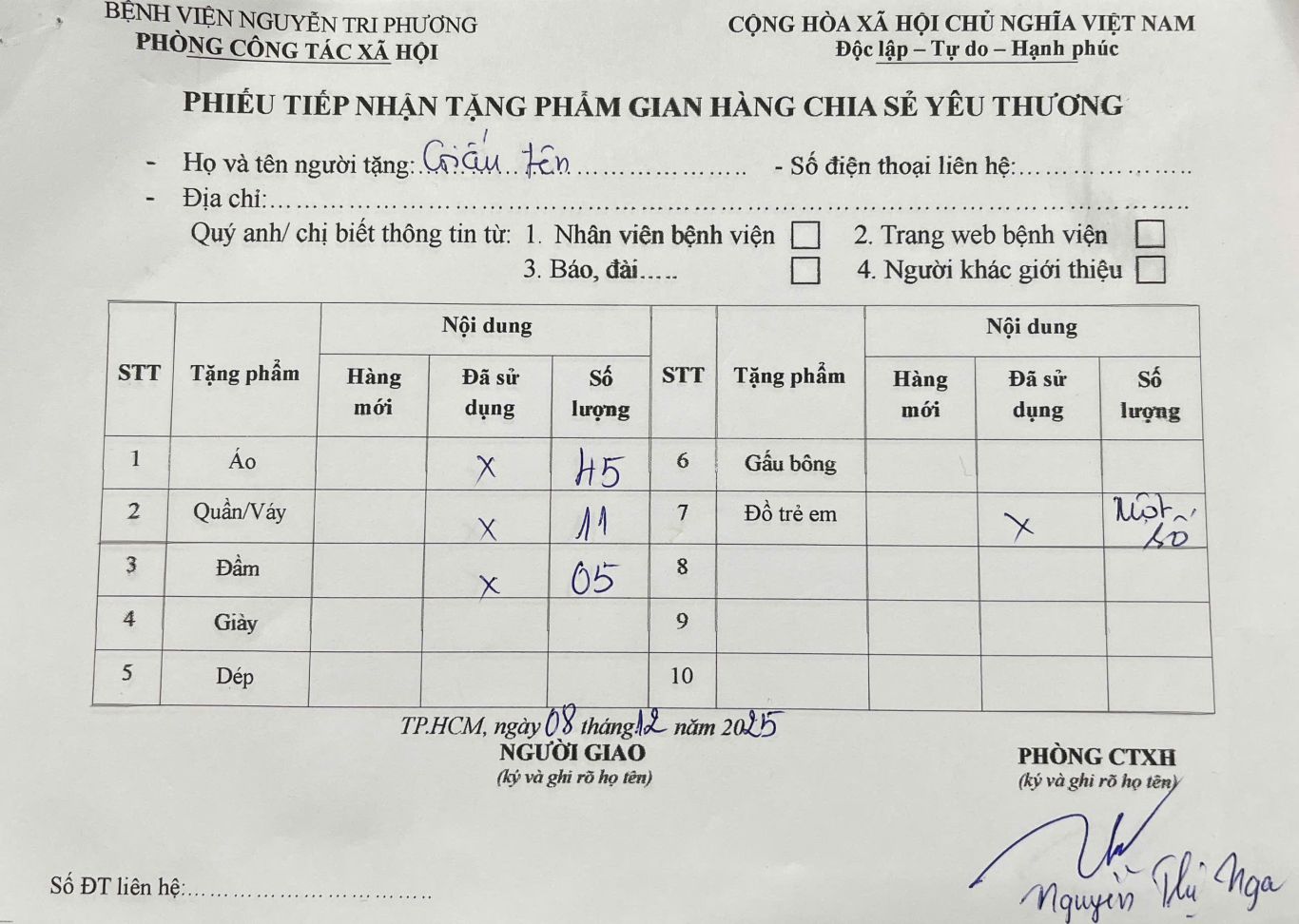 Thông tin tiếp nhận tặng phẩm gian hàng Chia sẻ Yêu thương ngày 08/12/2025:
