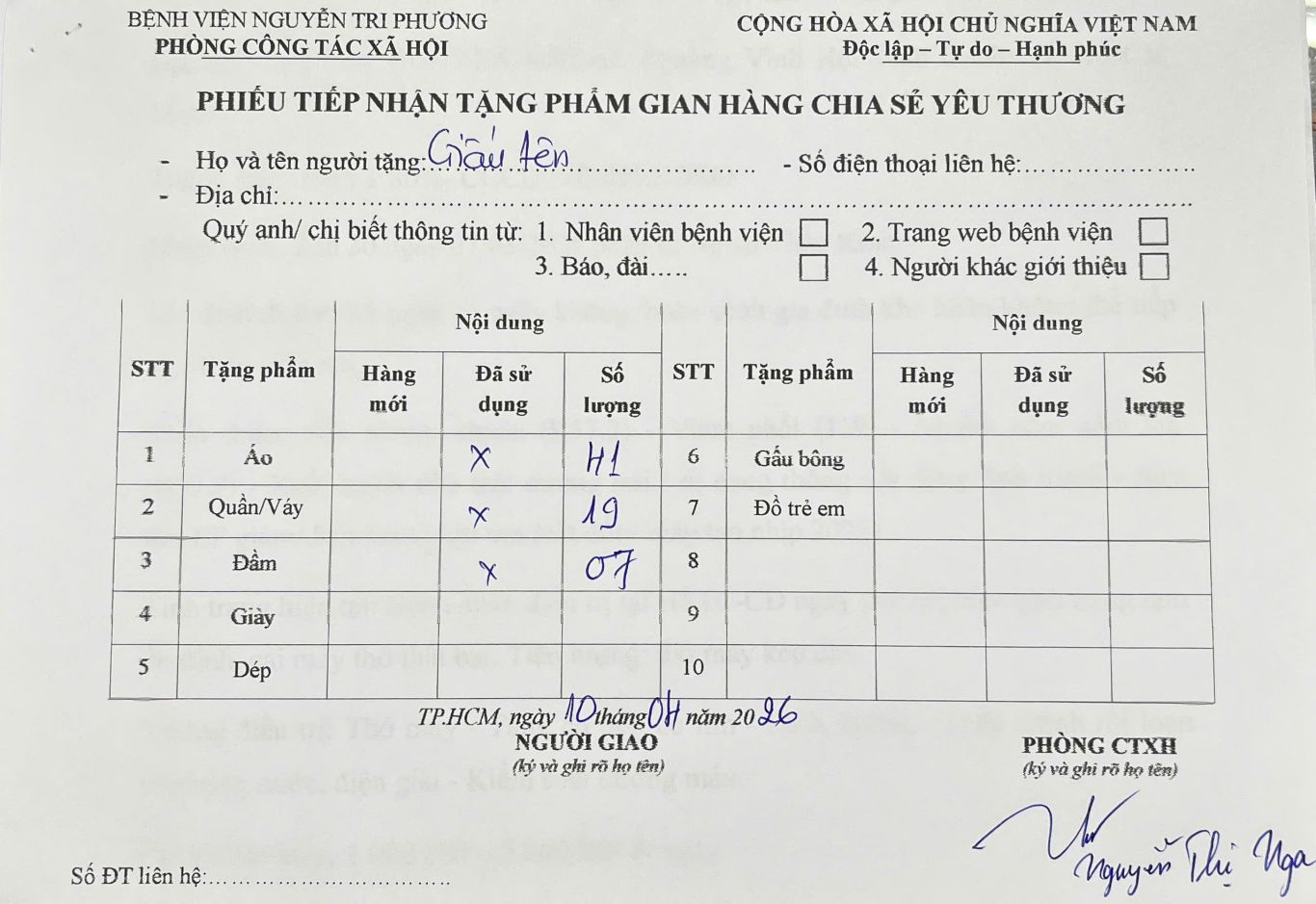 THÔNG TIN TIẾP NHẬN TẶNG PHẨM GIAN HÀNG CHIA SẺ YÊU THƯƠNG NGÀY 10/04/2026