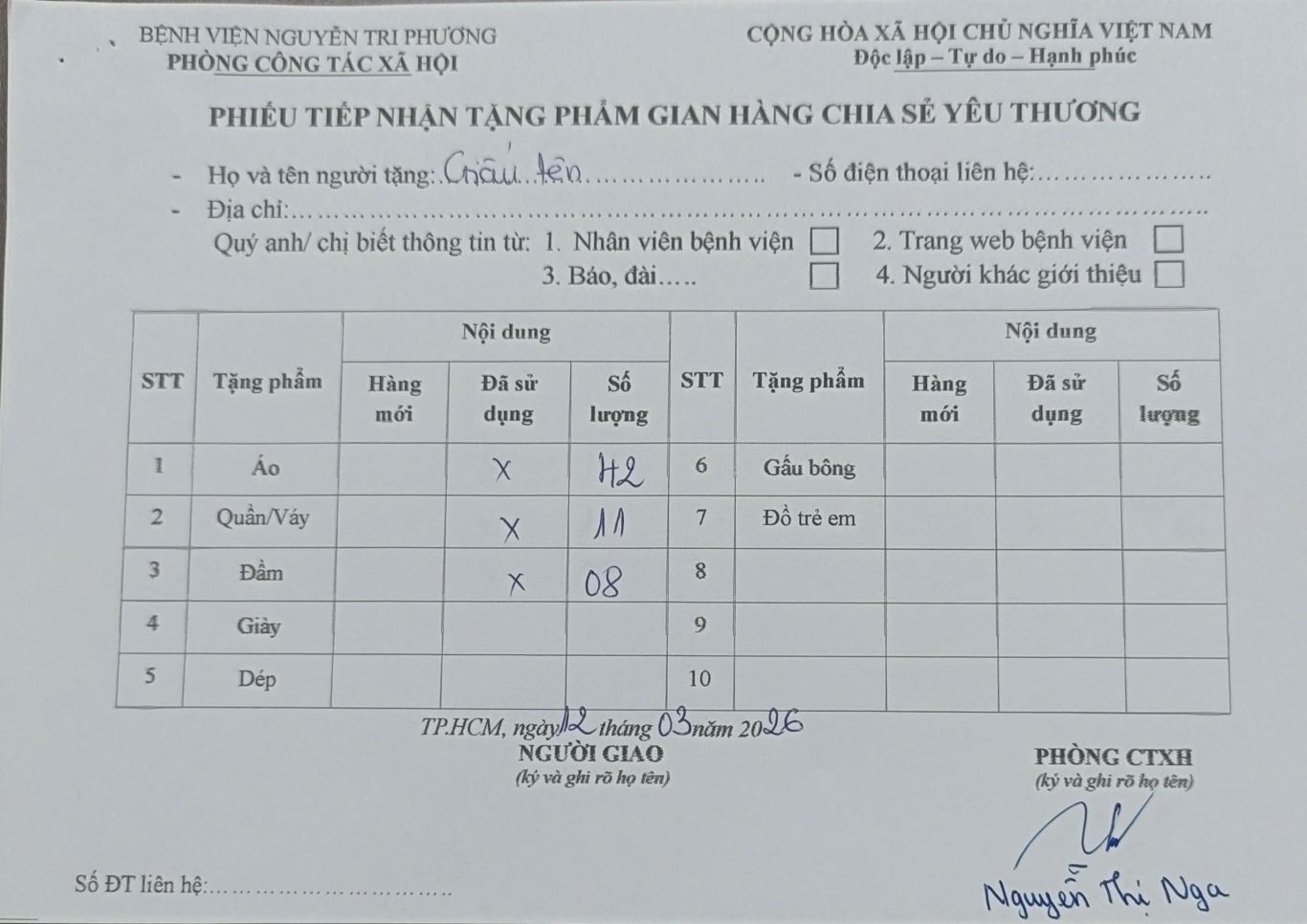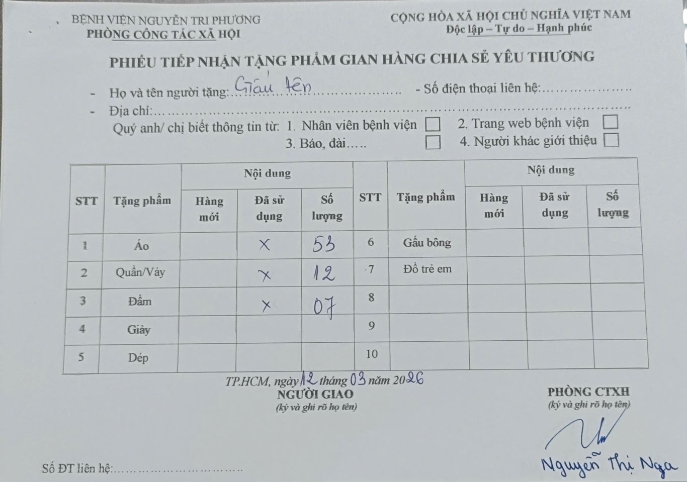 Thông tin tiếp nhận tặng phẩm gian hàng Chia sẻ Yêu thương ngày 12/03/2026:
