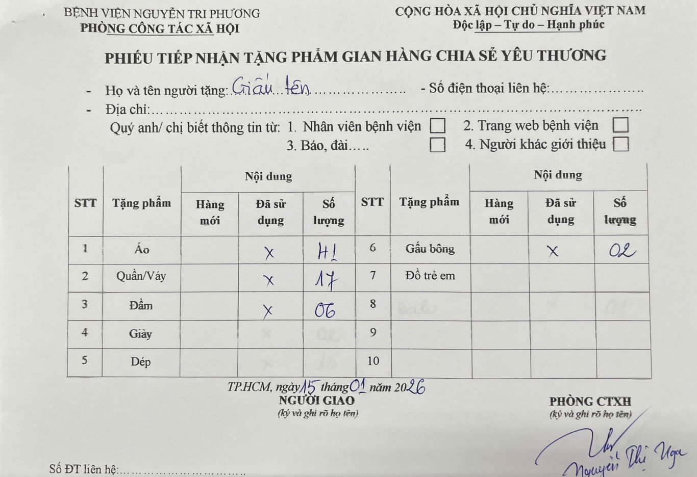 Thông tin tiếp nhận tặng phẩm gian hàng Chia sẻ Yêu thương ngày 15/01/2026: