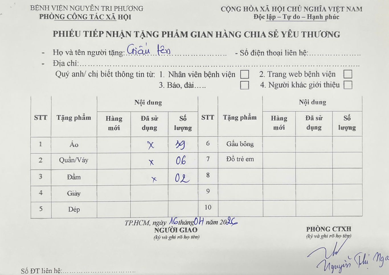 Thông tin tiếp nhận tặng phẩm gian hàng Chia sẻ Yêu thương ngày 16/04/2026: