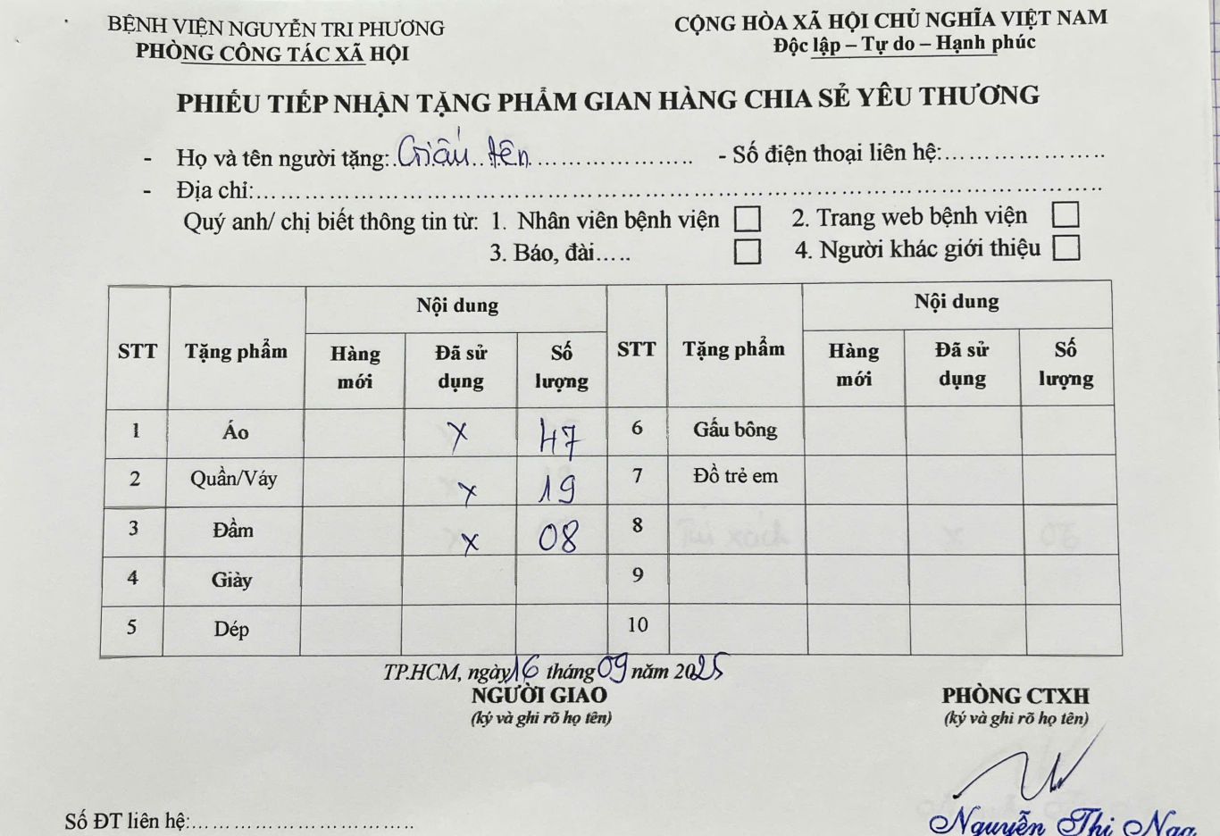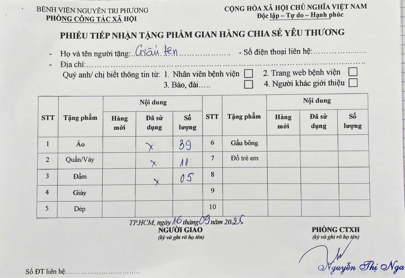 Thông tin tiếp nhận tặng phẩm gian hàng Chia sẻ Yêu thương ngày 16/09/2025: