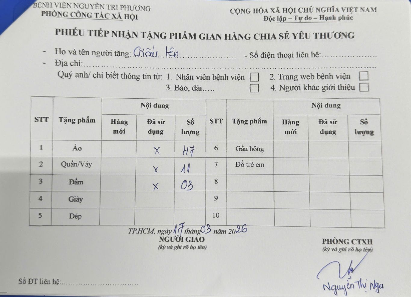 THÔNG TIN TIẾP NHẬN TẶNG PHẨM GIAN HÀNG CHIA SẺ YÊU THƯƠNG NGÀY 17/03/2026