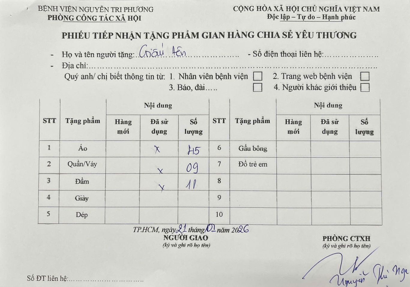 Thông tin tiếp nhận tặng phẩm gian hàng Chia sẻ Yêu thương ngày 21/01/2026: