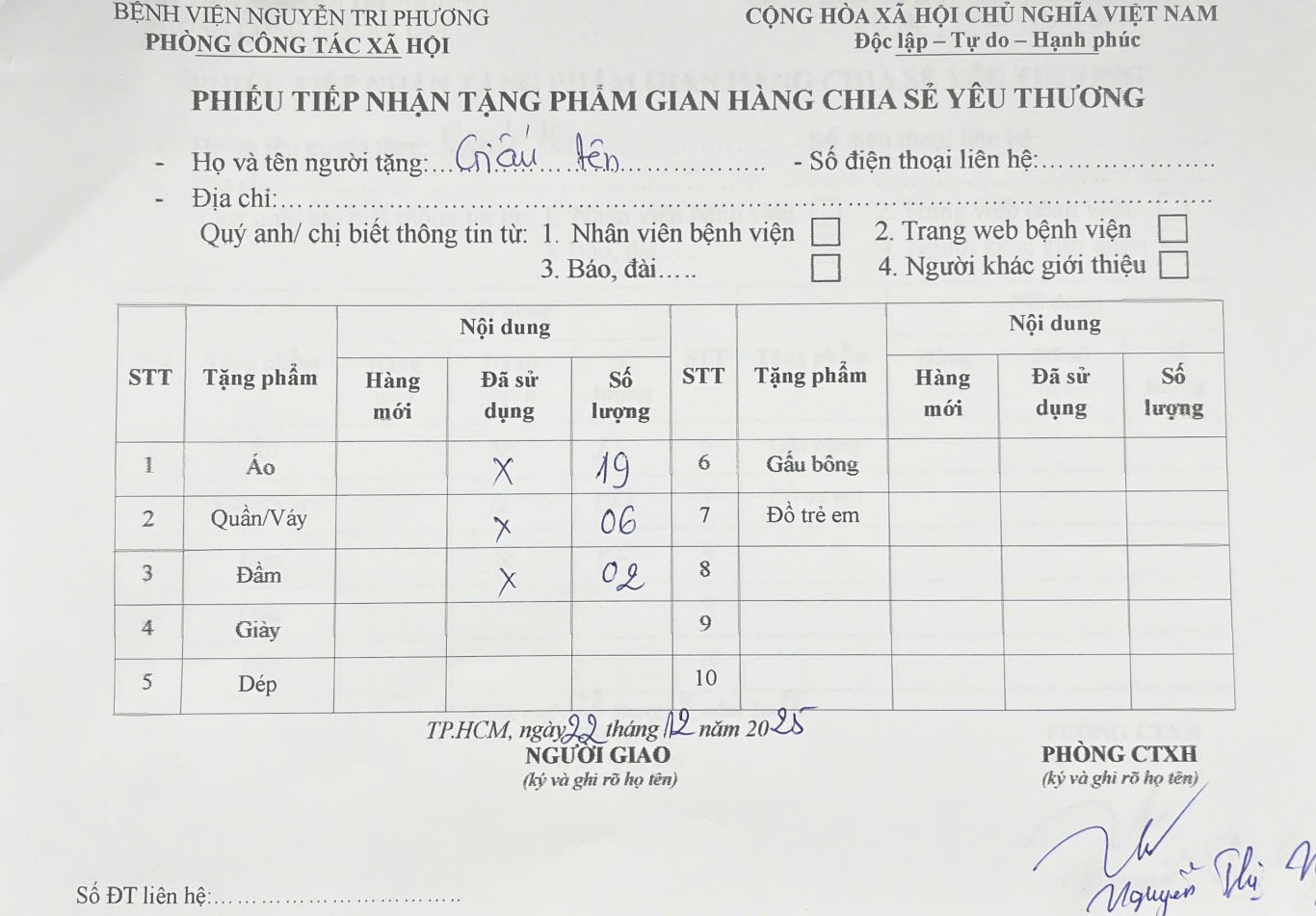 THÔNG TIN TIẾP NHẬN TẶNG PHẨM GIAN HÀNG CHIA SẺ YÊU THƯƠNG NGÀY 22/12/2025