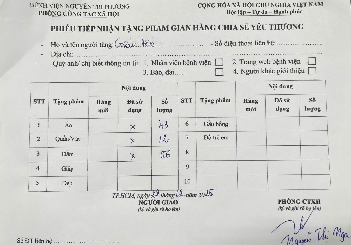 Thông tin tiếp nhận tặng phẩm gian hàng Chia sẻ Yêu thương ngày 22/12/2025: