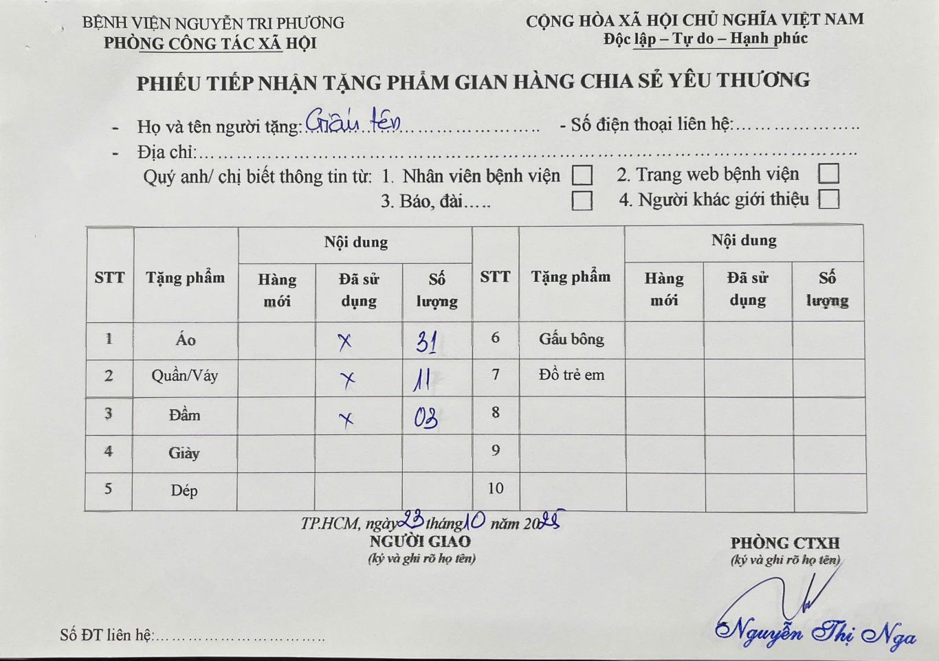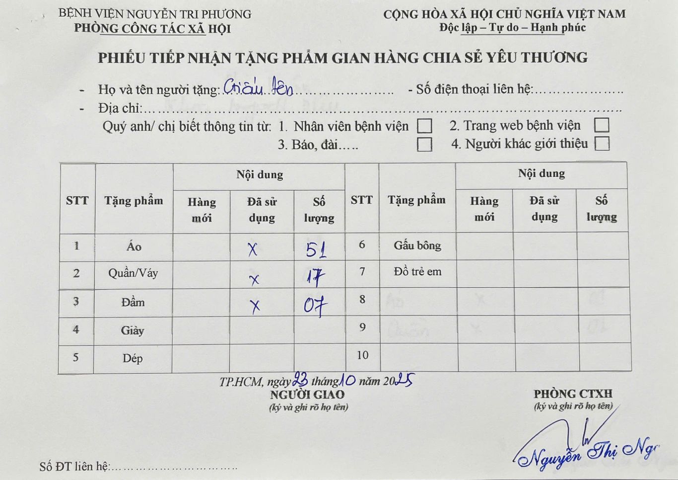 THÔNG TIN TIẾP NHẬN TẶNG PHẨM GIAN HÀNG CHIA SẺ YÊU THƯƠNG NGÀY 23/10/2025