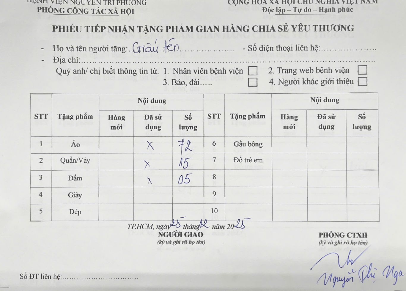 Thông tin tiếp nhận tặng phẩm gian hàng Chia sẻ Yêu thương ngày 25/12/2025: