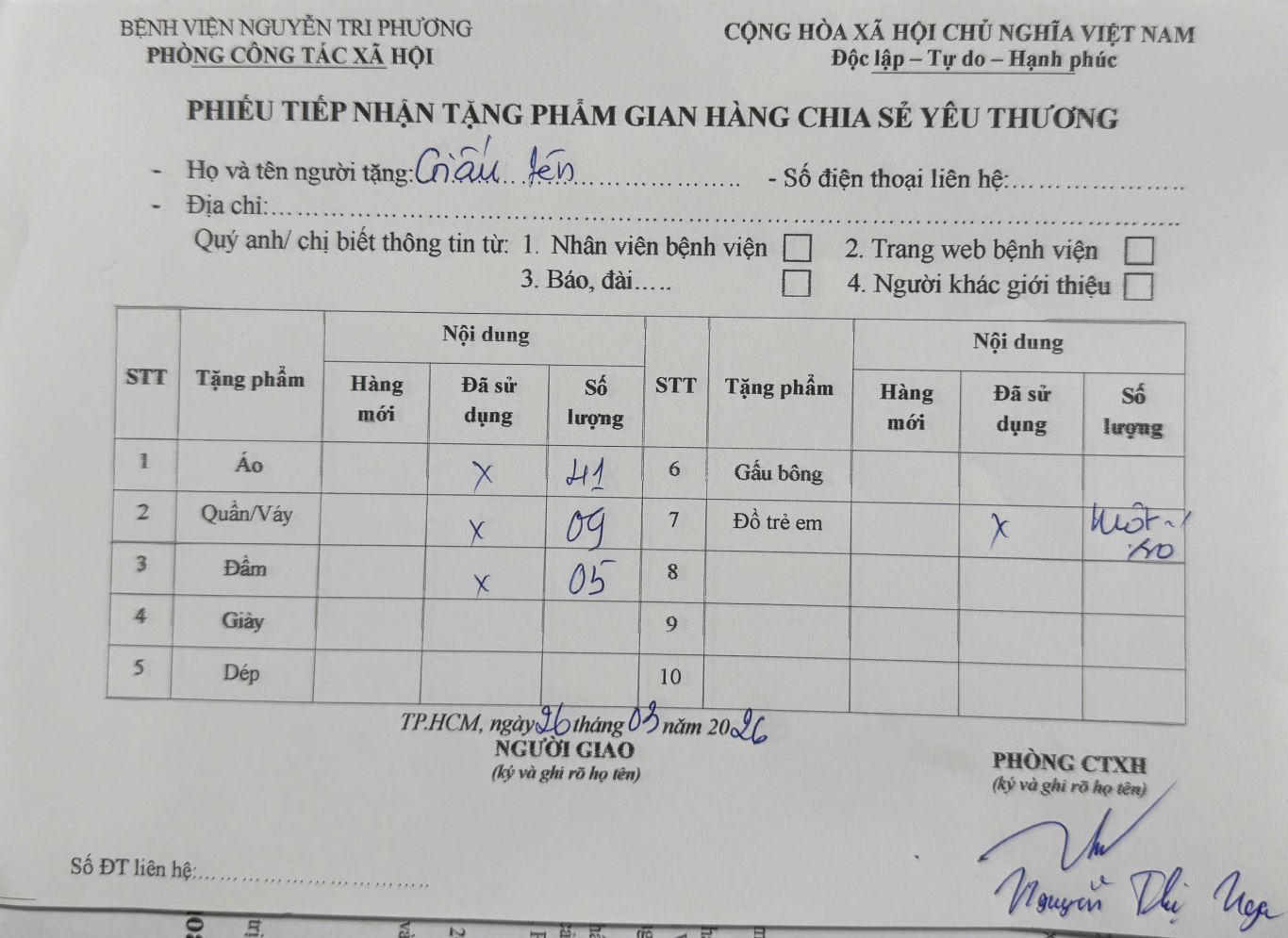 THÔNG TIN TIẾP NHẬN TẶNG PHẨM GIAN HÀNG CHIA SẺ YÊU THƯƠNG NGÀY 26/03/2026