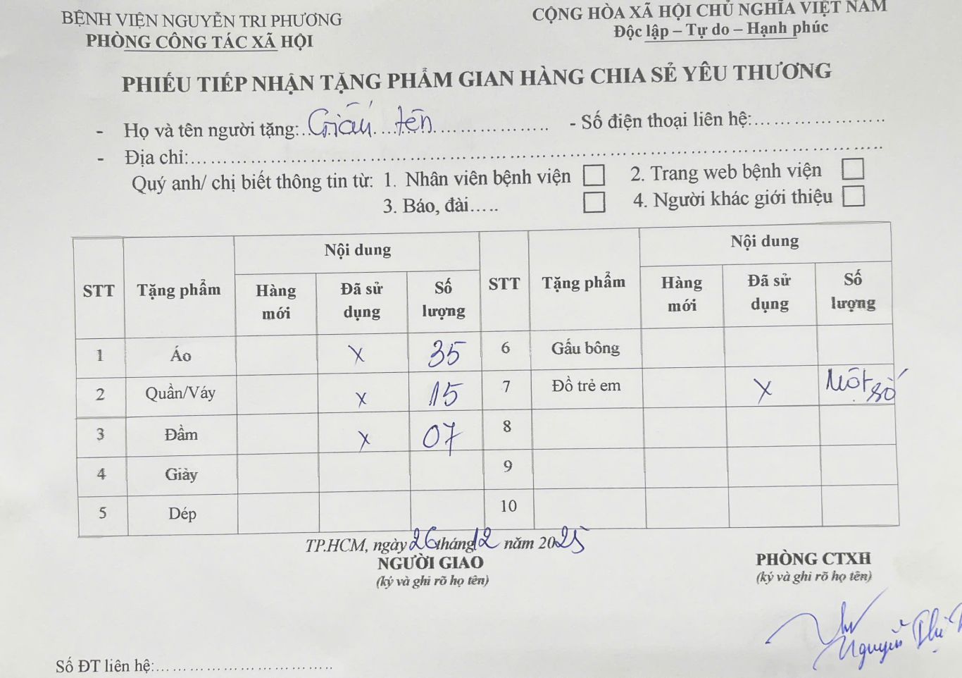 Thông tin tiếp nhận tặng phẩm gian hàng Chia sẻ Yêu thương ngày 26/12/2025: