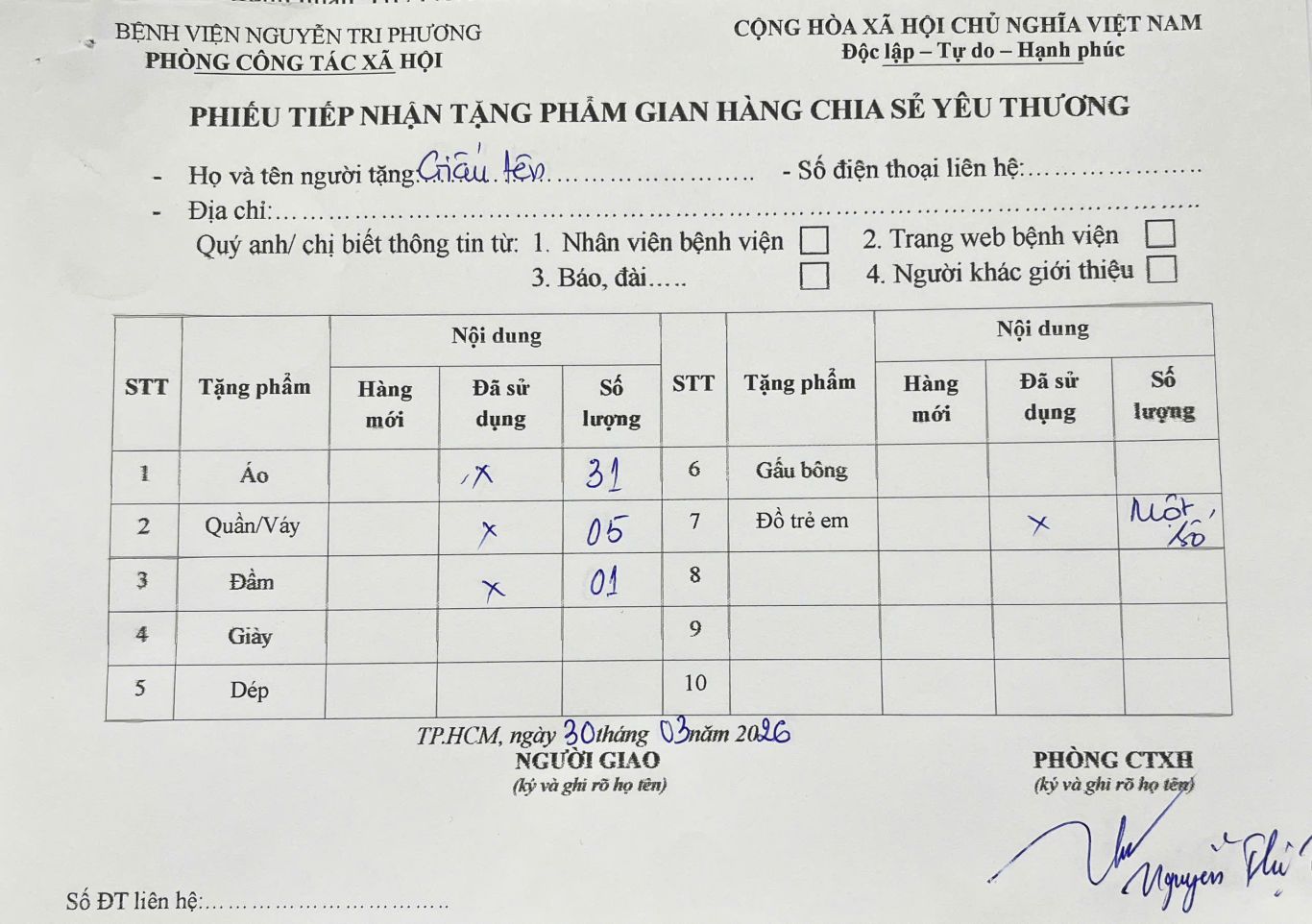 Thông tin tiếp nhận tặng phẩm gian hàng Chia sẻ Yêu thương ngày 30/03/2026: