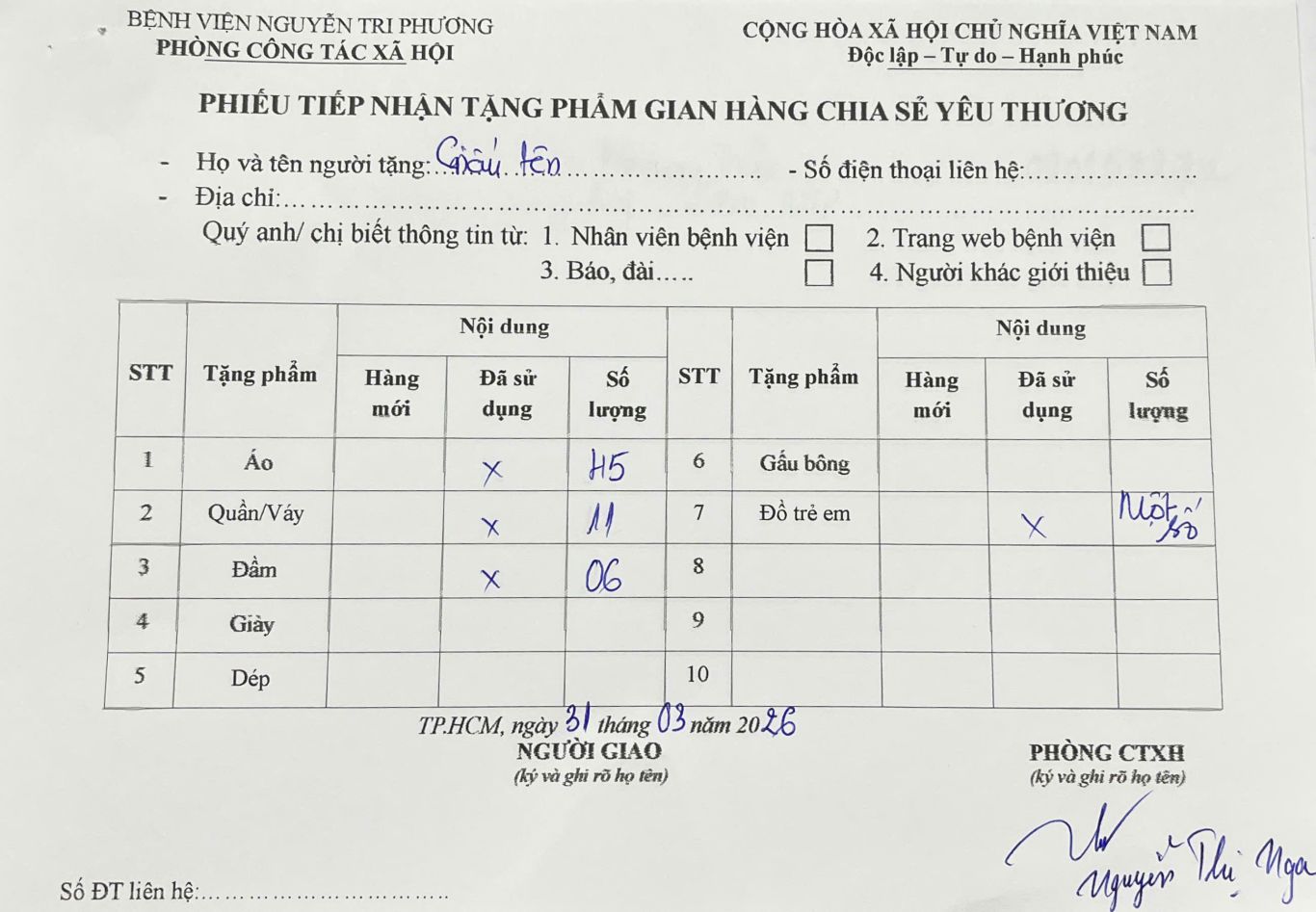 Thông tin tiếp nhận tặng phẩm gian hàng Chia sẻ Yêu thương ngày 31/03/2026: