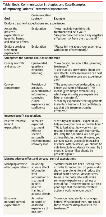 Việc đáp ứng kỳ vọng của bệnh nhân có thể cải thiện kết quả điều trị và giảm thiểu tác dụng phụ. Các chiến lược dựa trên bằng chứng cho phép bác sĩ lâm sàng truyền đạt những kỳ vọng thực tế theo cách cải thiện các cuộc gặp gỡ lâm sàng.