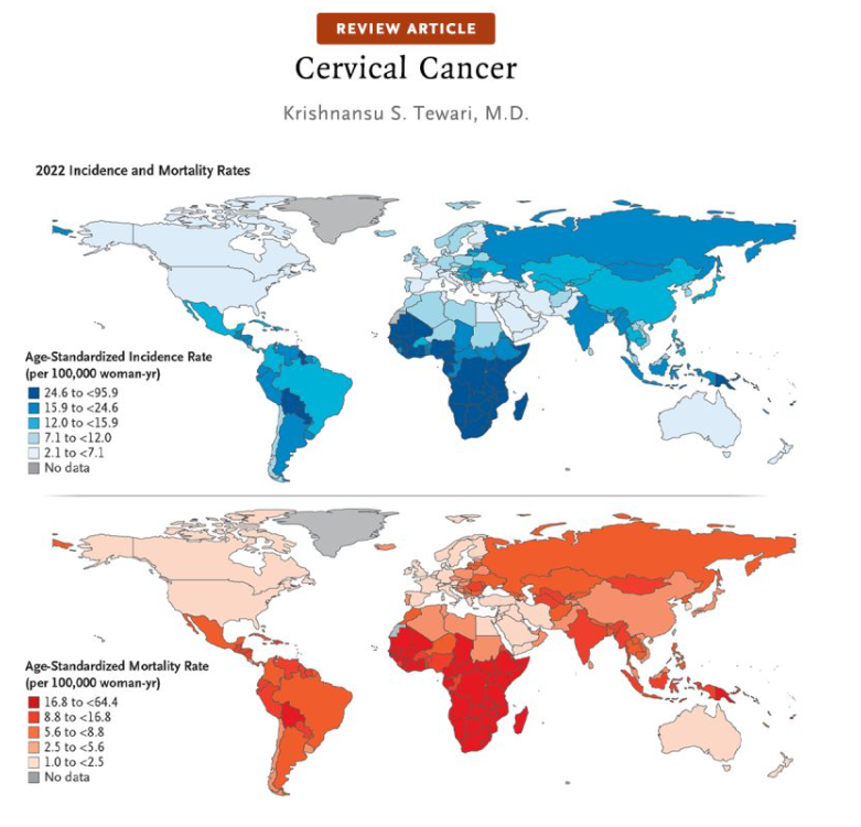 Năm 2020, ước tính có 604.127 ca ung thư cổ tử cung mới được báo cáo trên toàn thế giới, với 341.831 ca tử vong liên quan. Các khu vực thiếu nguồn lực ở Mỹ Latinh, Châu Phi cận Sahara và Đông Nam Á, bao gồm cả Ấn Độ, có gánh nặng bệnh tật cao (được thể hiện ở đây trong Hình 1A; và trong đồ họa tương tác tại NEJM.org). Có mối tương quan rõ ràng giữa tình trạng kinh tế xã hội và tỷ lệ mắc ung thư cổ tử cung và tỷ lệ tử vong, với tỷ lệ mắc và tỷ lệ tử vong ngày càng thấp khi Chỉ số phát triển con người trung bình của quốc gia tăng lên. Năm 2024, tổng cộng có 13.820 ca mới và 4.360 ca tử vong liên quan dự kiến sẽ xảy ra tại Hoa Kỳ; tại Liên minh Châu Âu, dự kiến có 58.169 ca, với 22.989 ca tử vong liên quan. Độ tuổi trung bình khi được chẩn đoán là 50. Các yếu tố nguy cơ gây ung thư cổ tử cung có liên quan đến hành vi tình dục. Quan hệ tình dục lần đầu ở độ tuổi sớm, có nhiều bạn tình, quan hệ với nhiều bạn tình, không được tiếp cận với dịch vụ sàng lọc và tiền sử xét nghiệm Papanicolaou bất thường, nhiễm vi-rút u nhú ở người (HPV), loạn sản cổ tử cung hoặc nhiễm trùng lây truyền qua đường tình dục (hoặc kết hợp các yếu tố này) làm tăng nguy cơ. Sử dụng thuốc lá và thuốc tránh thai đường uống cũng được coi là các yếu tố làm tăng nguy cơ.