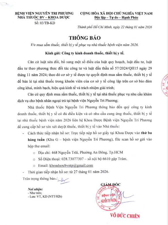 Nhà thuốc Bệnh Viện Nguyễn Tri Phương thông báo đến quý công ty kinh doanh thuốc, thiết bị y tế có đủ điều kiện và có nhu cầu cung ứng thuốc, thiết bị y tế tại nhà thuốc bệnh viện năm 2026 liên hệ Khoa Dược Bệnh viện Nguyễn Tri Phương để cung cấp hồ sơ xin xét duyệt thuốc, thiết bị y tế vào Nhà thuốc: