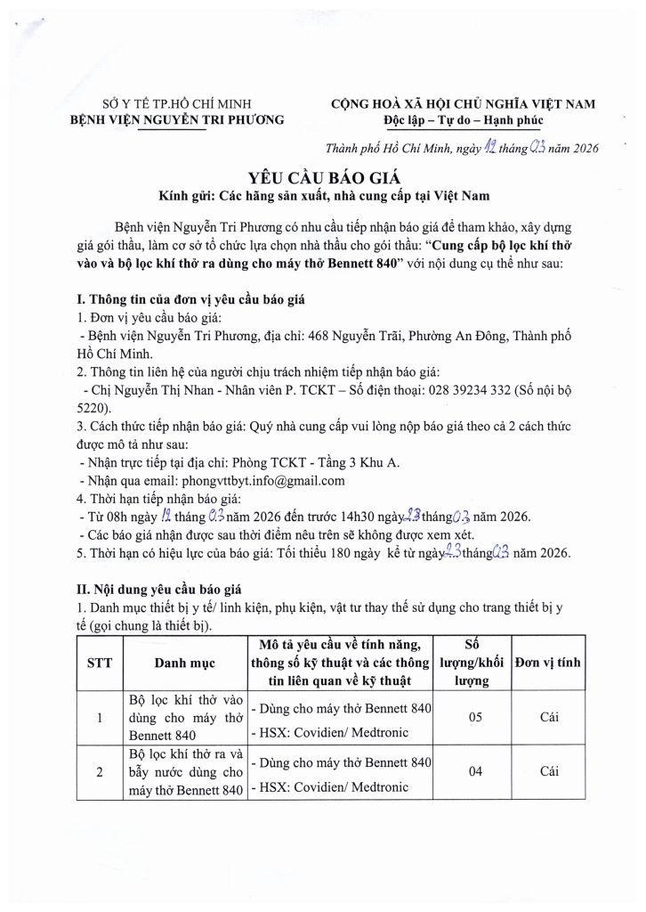 Thông báo vv mời chào giá cung cấp bộ lọc khí thở vào và bộ lọc khí thở ra dùng cho máy thở Bennett 840