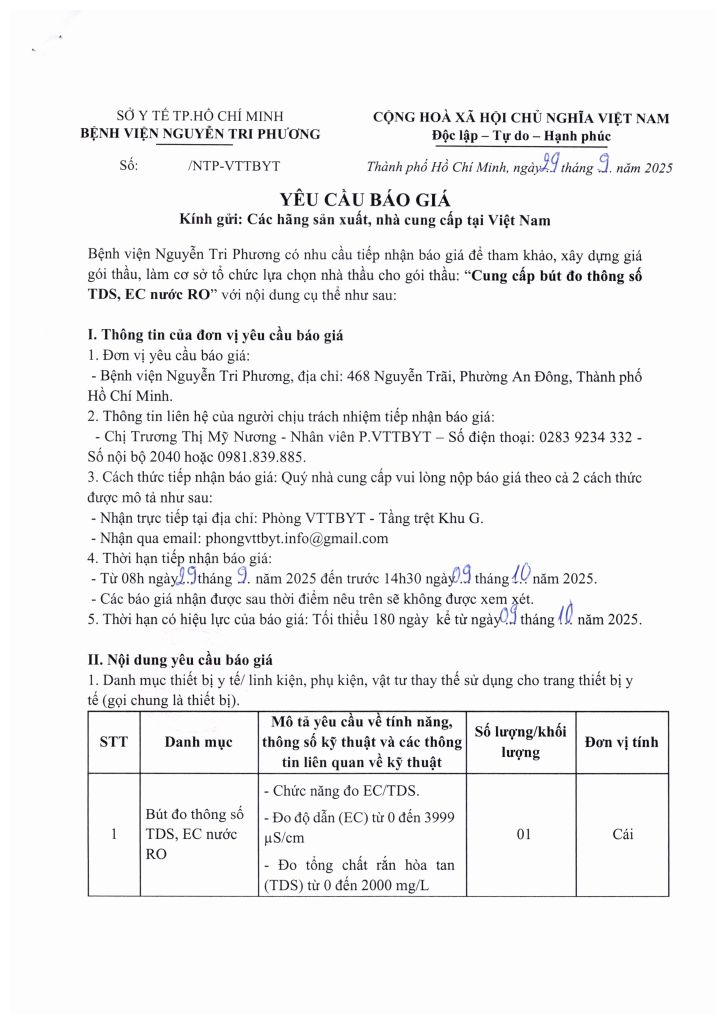 Thông báo vv mời chào giá cung cấp bút đo thông số TDS, EC nước RO
