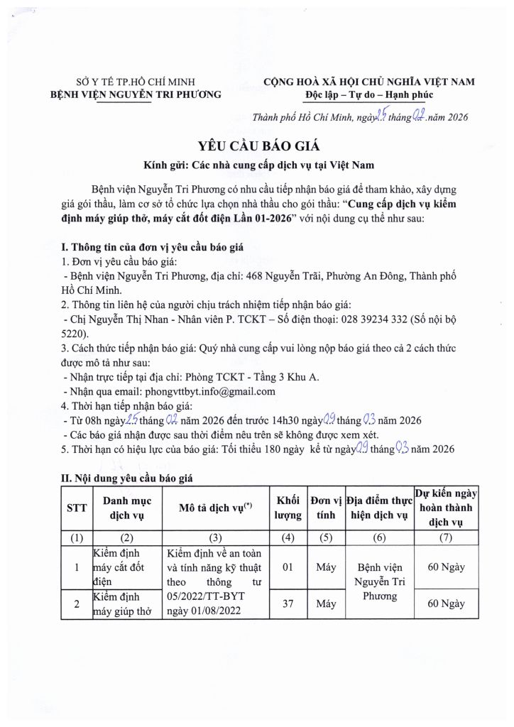 Thông báo vv mời chào giá cung cấp dịch vụ kiểm định máy giúp thở, máy cắt đốt điện lần 1 - 2026