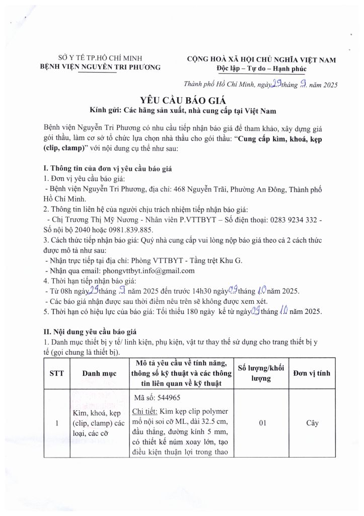Thông báo vv mời chào giá cung cấp kim, khóa, kẹp (clip, clamp)