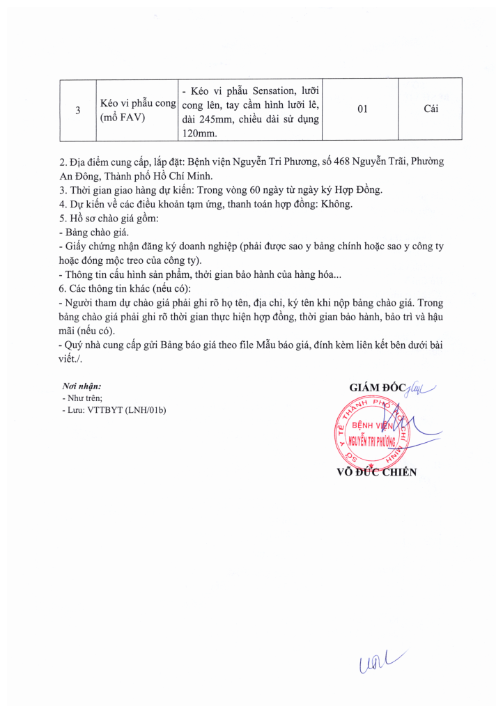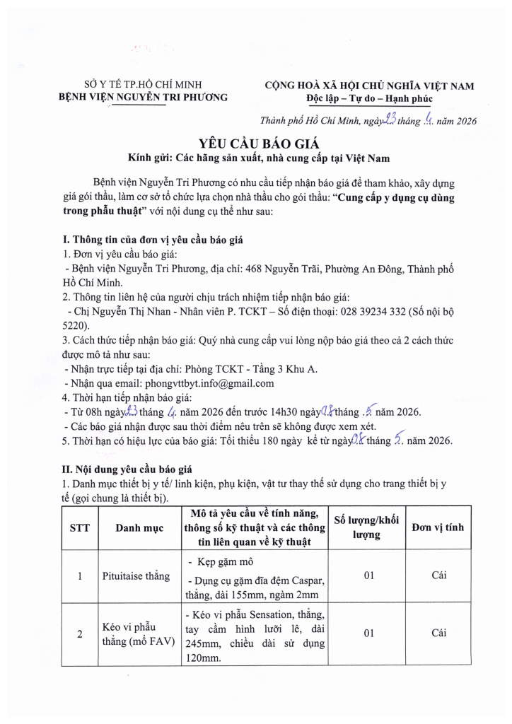 Thông báo vv mời chào giá cung cấp y dụng cụ dùng trong phẫu thuật