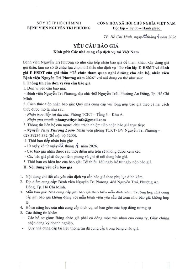 Thông báo vv mời chào giá gói thầu: Tư vấn lập E-HSMT và đánh giá E-HSDT của gói thầu Tổ chức tham quan nghỉ dưỡng cho cán bộ Tải file tại đây