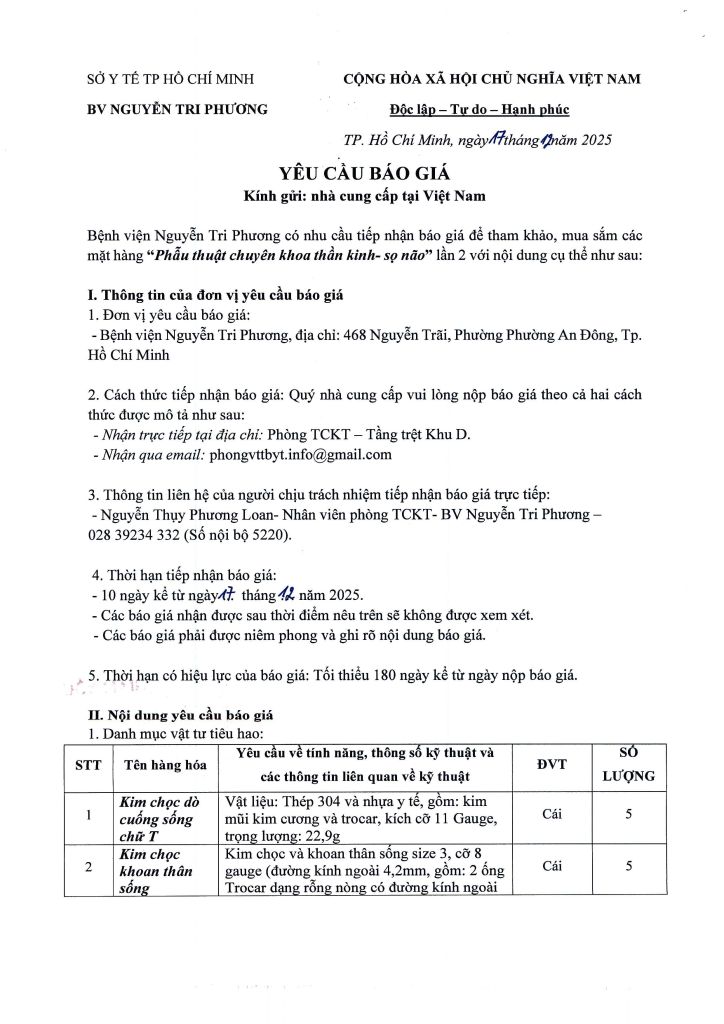 Thông báo vv mời chào giá mặt hàng: Phẫu thuật chuyên khoa thần kinh so não lần 2