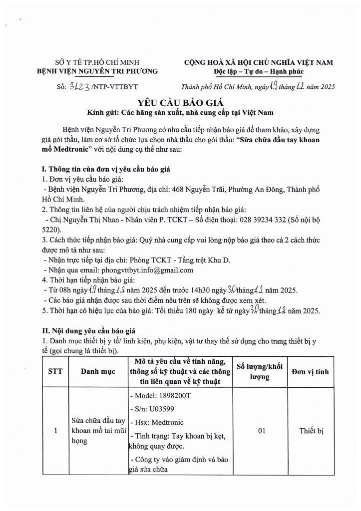 Thông báo vv mời chào giá sửa chữa đầu tay khoan mổ TMH Medtronic