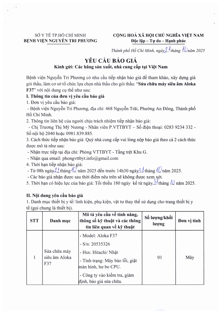 Thông báo vv mời chào giá sửa chữa máy siêu âm Aloka F37