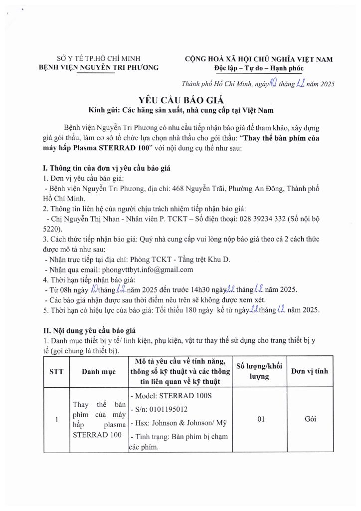 Thông báo vv mời chào giá thay thế bàn phím của máy hấp Plasma Sterrad 100