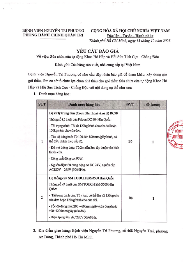 V/v mời chào giá gói thầu: Sửa chữa cửa tự động Khoa Hô Hấp và Hồi Sức Tích Cực - Chống Độc