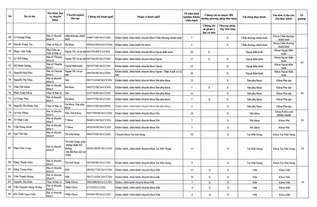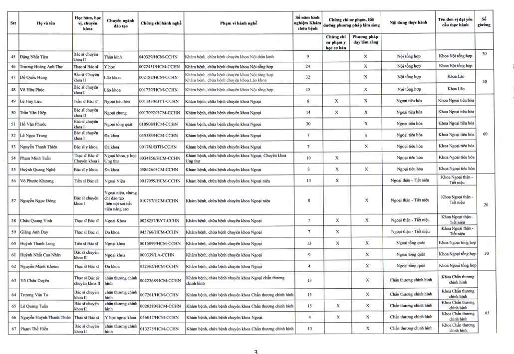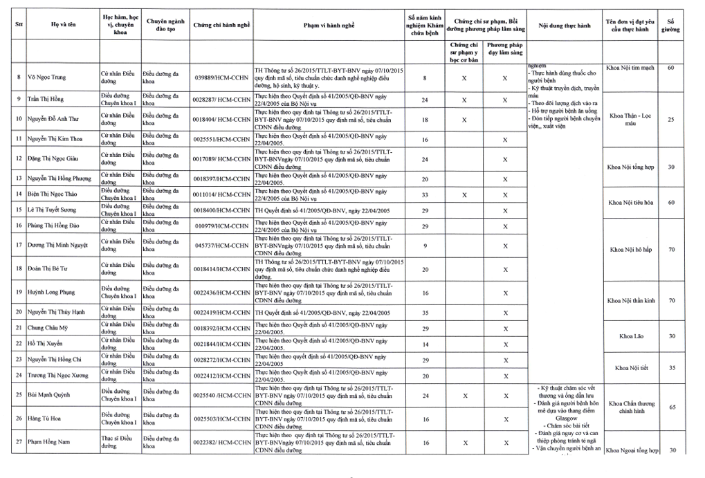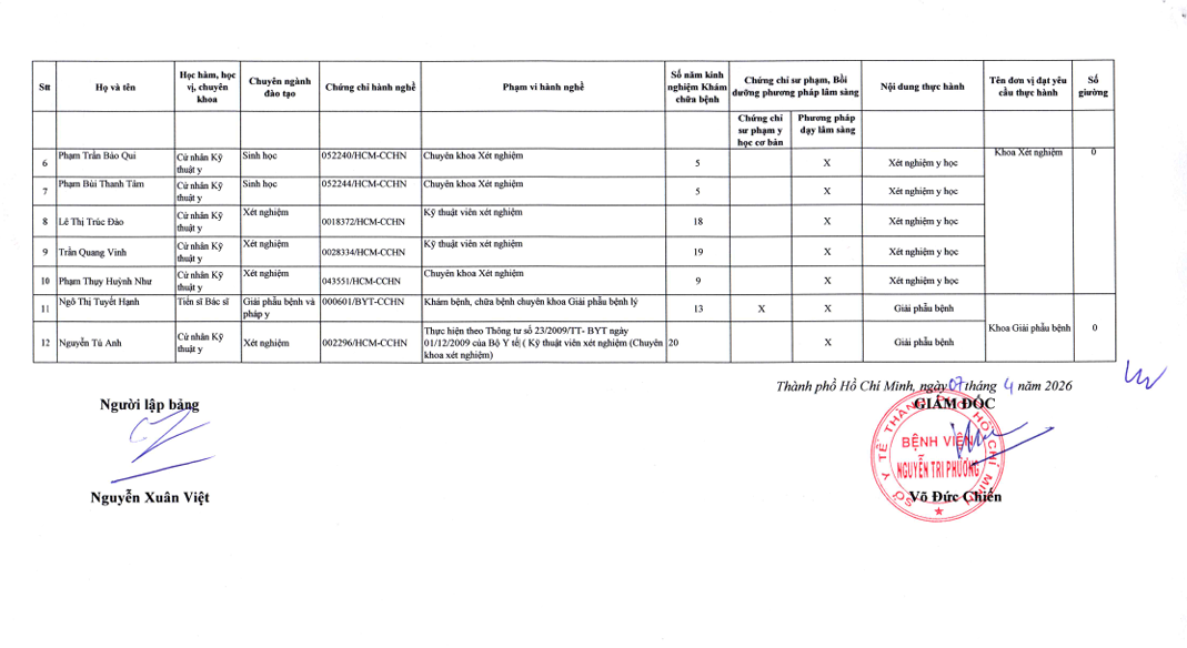 Danh sách người thực hành đối với chức danh Bác sĩ, Điều dưỡng, Kỹ thuật y Xét nghiệm tại Bệnh viện Nguyễn Tri Phương