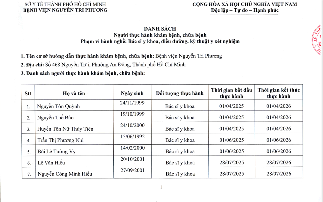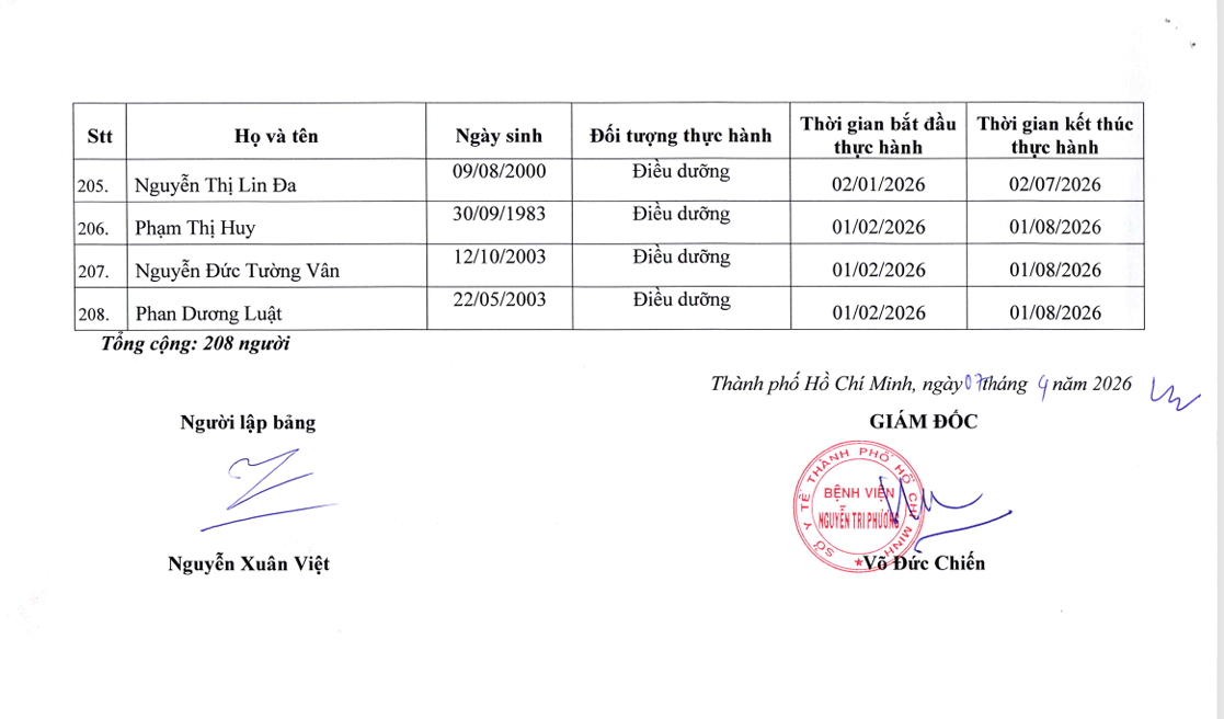 - Danh sách người thực hành đối với chức danh Bác sĩ, Điều dưỡng, Kỹ thuật y Xét nghiệm tại Bệnh viện Nguyễn Tri Phương