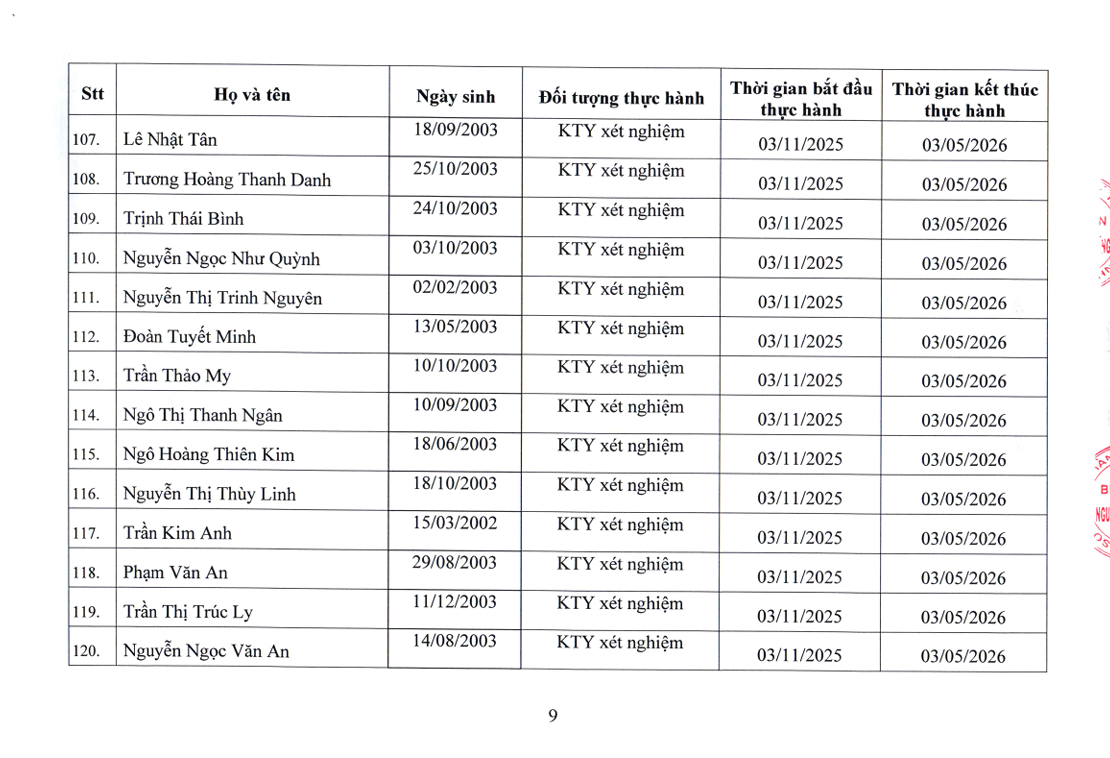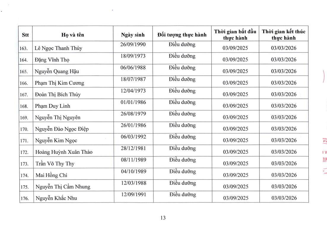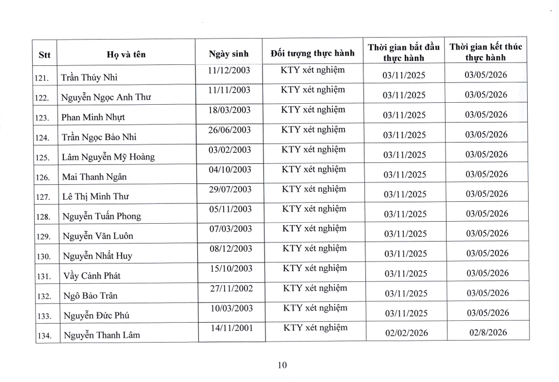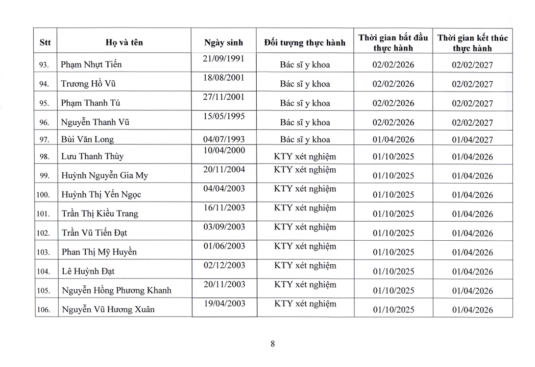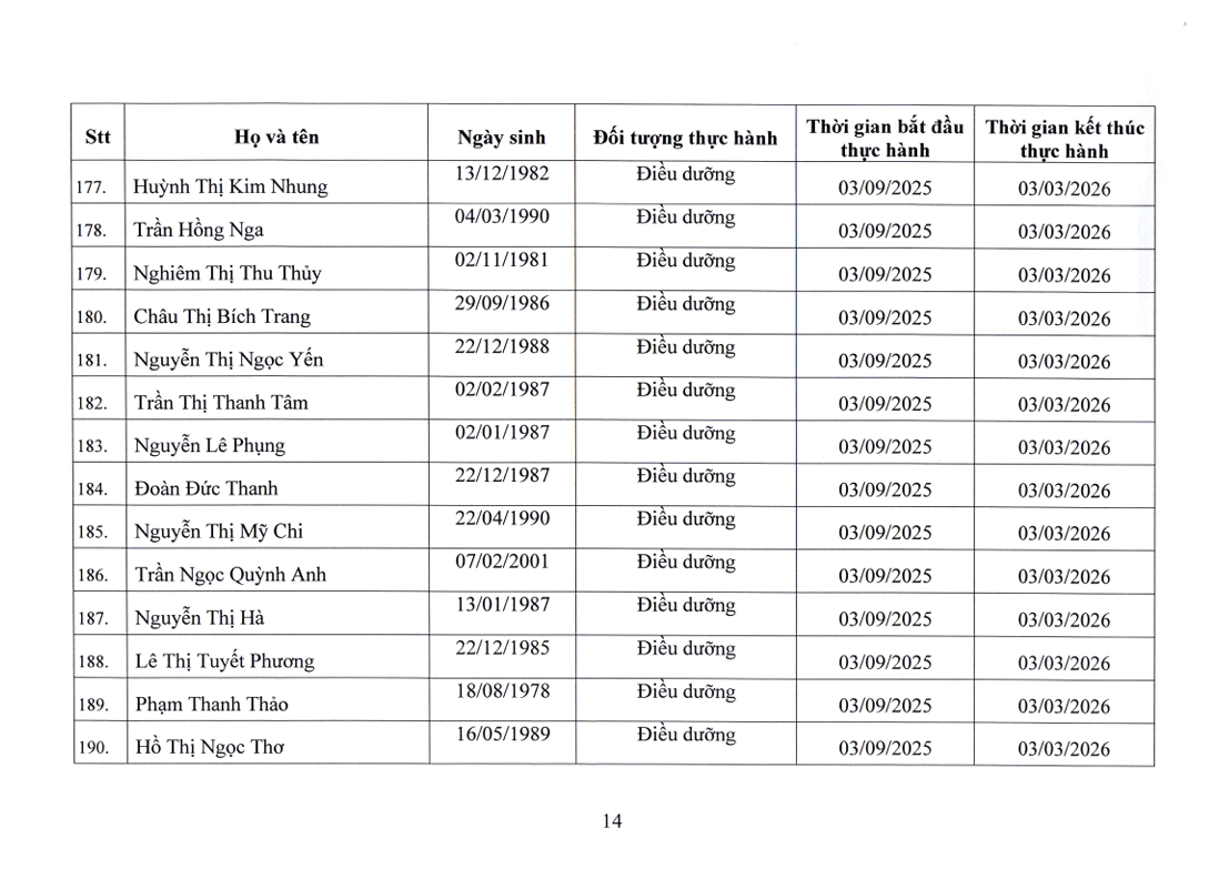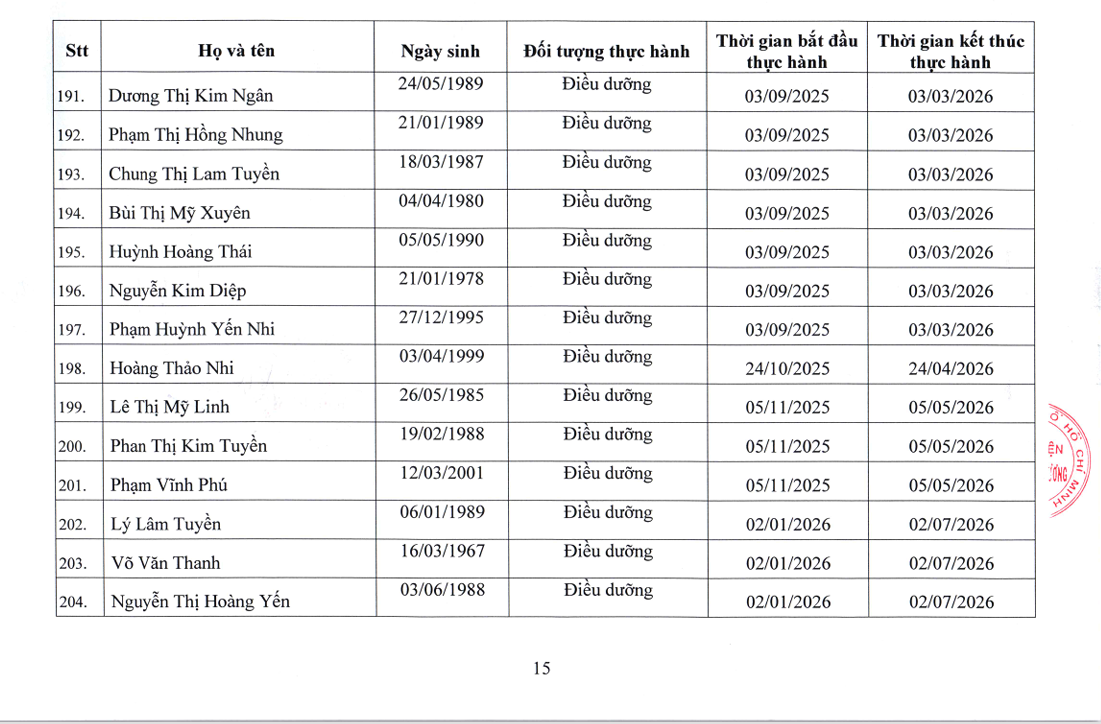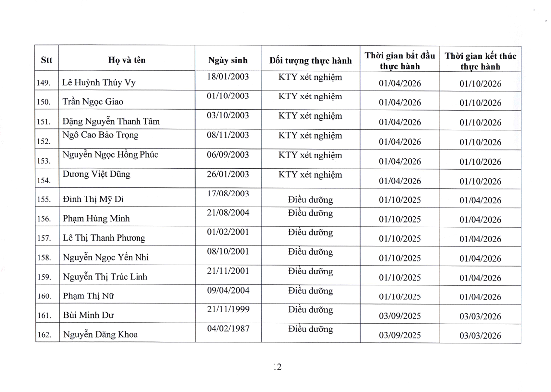 Danh sách người thực hành đối với chức danh Bác sĩ, Điều dưỡng, Kỹ thuật y Xét nghiệm tại Bệnh viện Nguyễn Tri Phương
