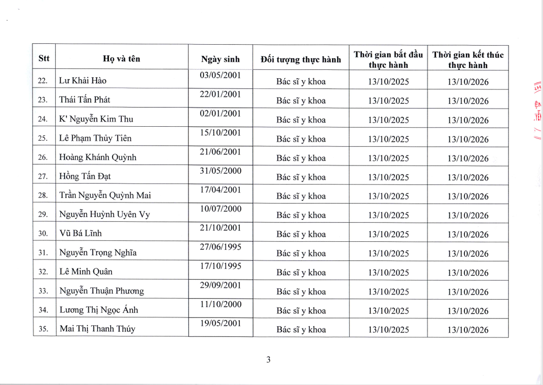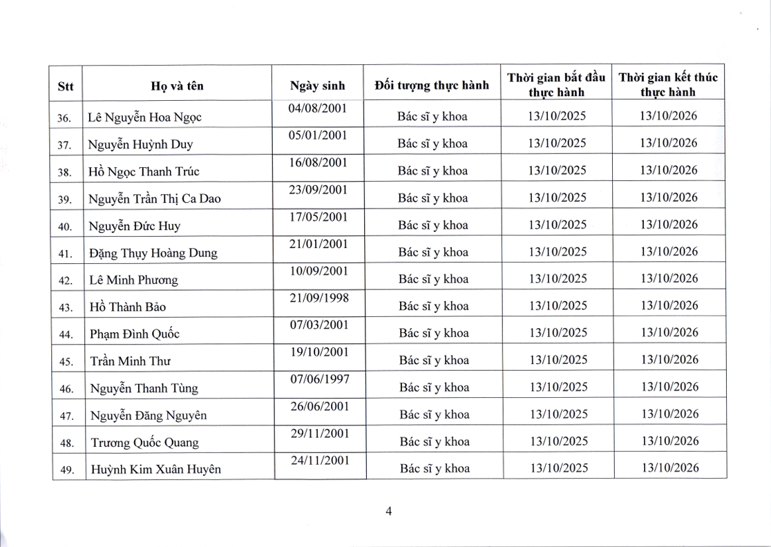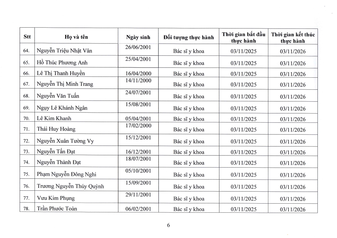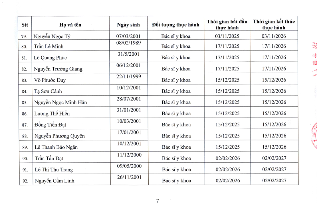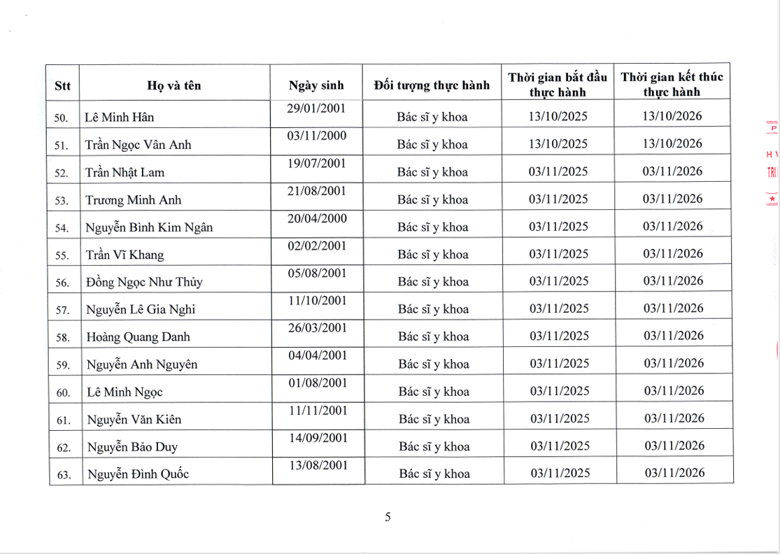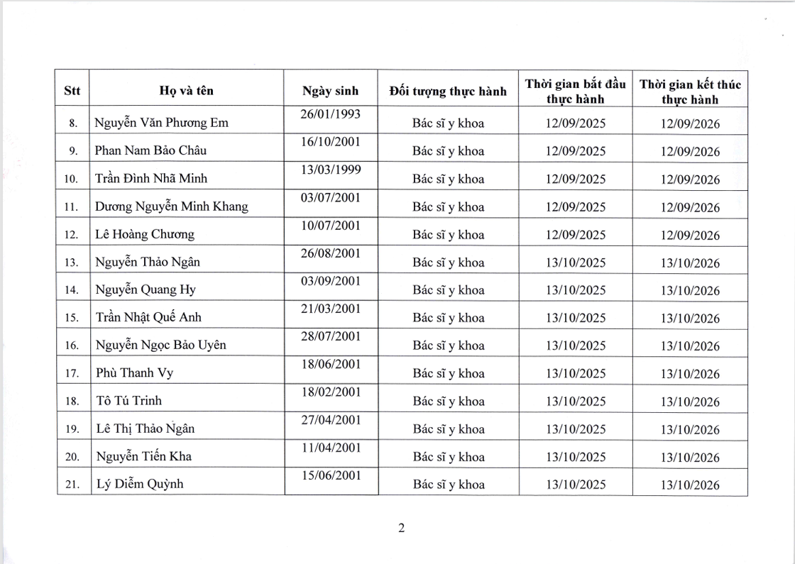 Danh sách người thực hành đối với chức danh Bác sĩ, Điều dưỡng, Kỹ thuật y Xét nghiệm tại Bệnh viện Nguyễn Tri Phương