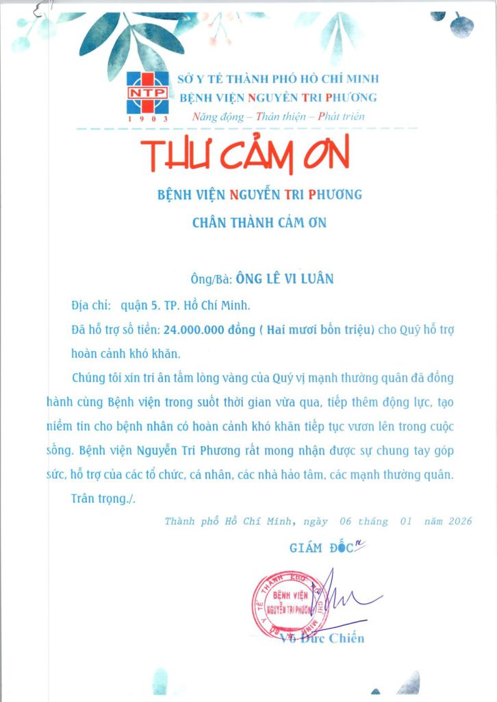 Trân trọng cảm ơn ôngLê Vi Luân đã hỗ trợ Quỹ hỗ trợ hoàn cảnh khó khăn tại Bệnh viện Nguyễn Tri Phương.