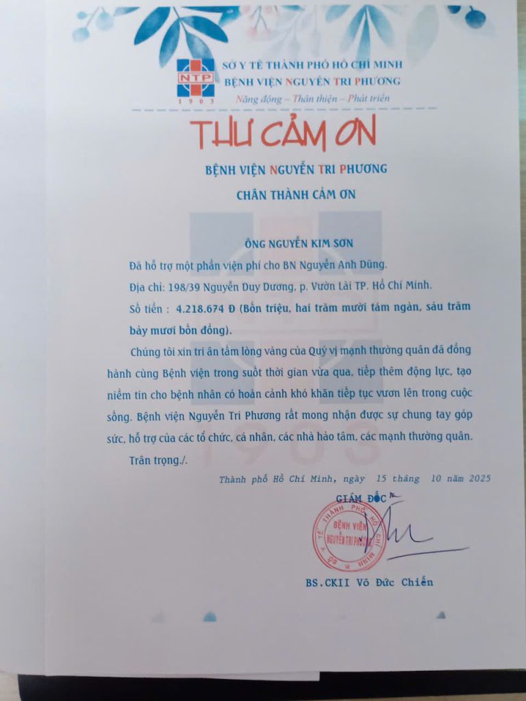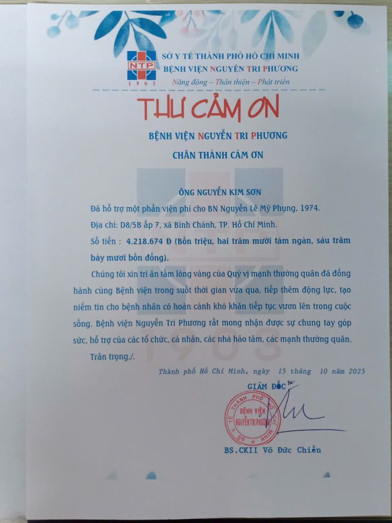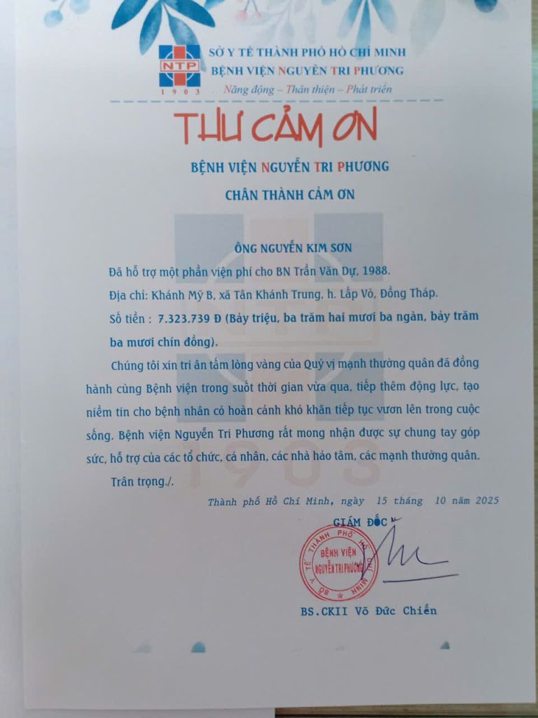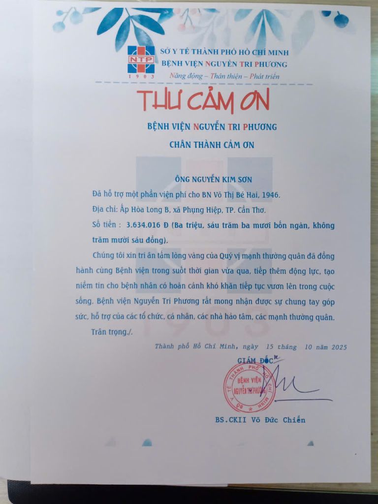 Trân trọng cảm ơn ông Nguyễn Kim Sơn đã hỗ trợ viện phí cho bệnh nhân có hoàn cảnh khó khăn tại Bệnh viện Nguyễn Tri Phương.