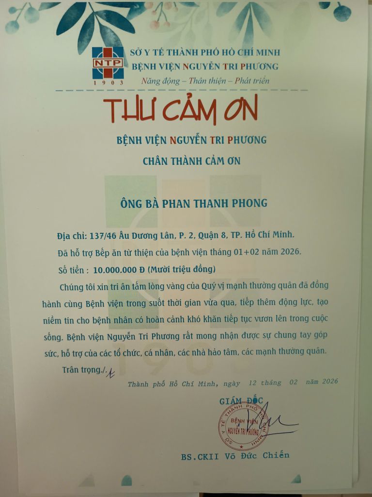 Trân trọng cảm ơn Ông Bà Phan Thanh Phong đã hỗ trợ Bếp ăn từ thiện tháng 01 + 02 của Bệnh viện Nguyễn Tri Phương.