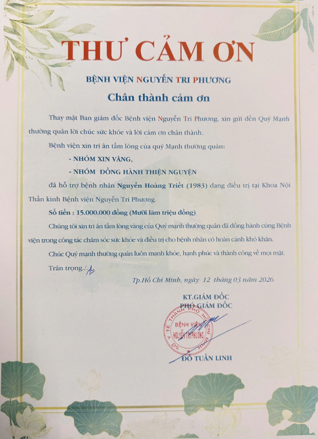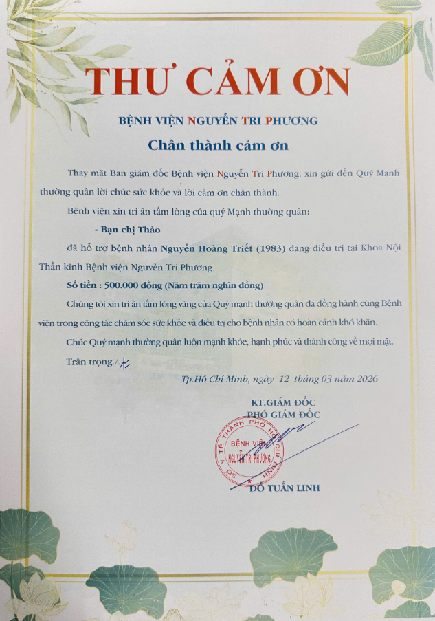 Đã hỗ trợ viện phí cho bệnh nhân tại Bệnh viện Nguyễn Tri Phương.