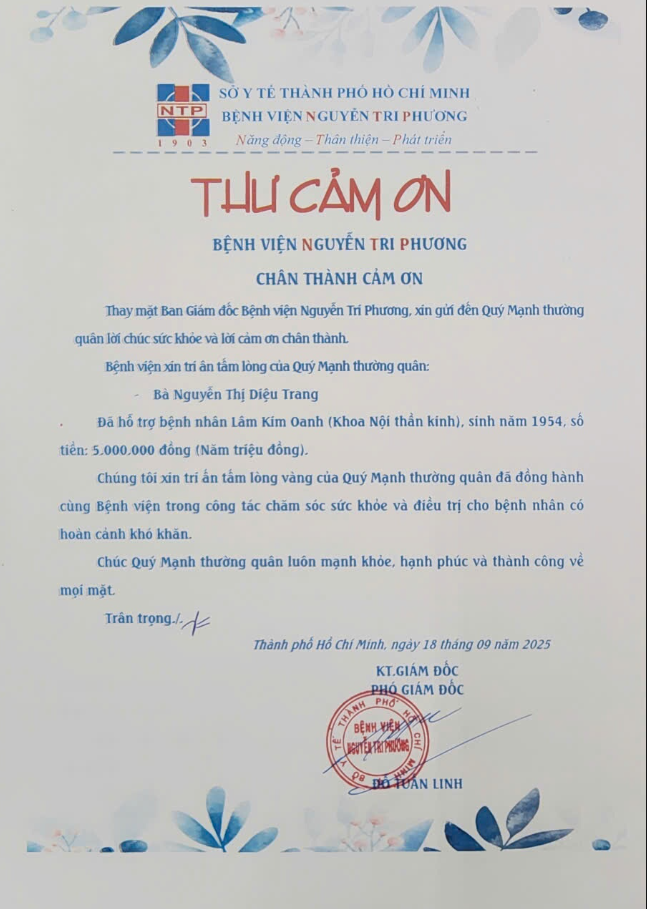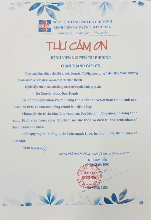 Đã hỗ trợ viện phí cho bệnh nhân tại Bệnh viện Nguyễn Tri Phương.