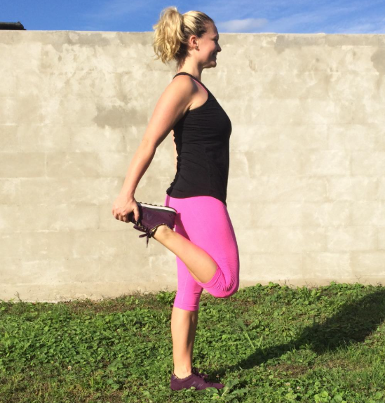 Cách thực hiện: đứng chân rộng bằng hông, cẩn thận co một bên đầu gối và cố đá bàn chân về mông bằng chân đó. Tay cùng bên với lấy bàn chân và giữ, nhắm mắt nếu có thể. Đổi bên và lặp lại.