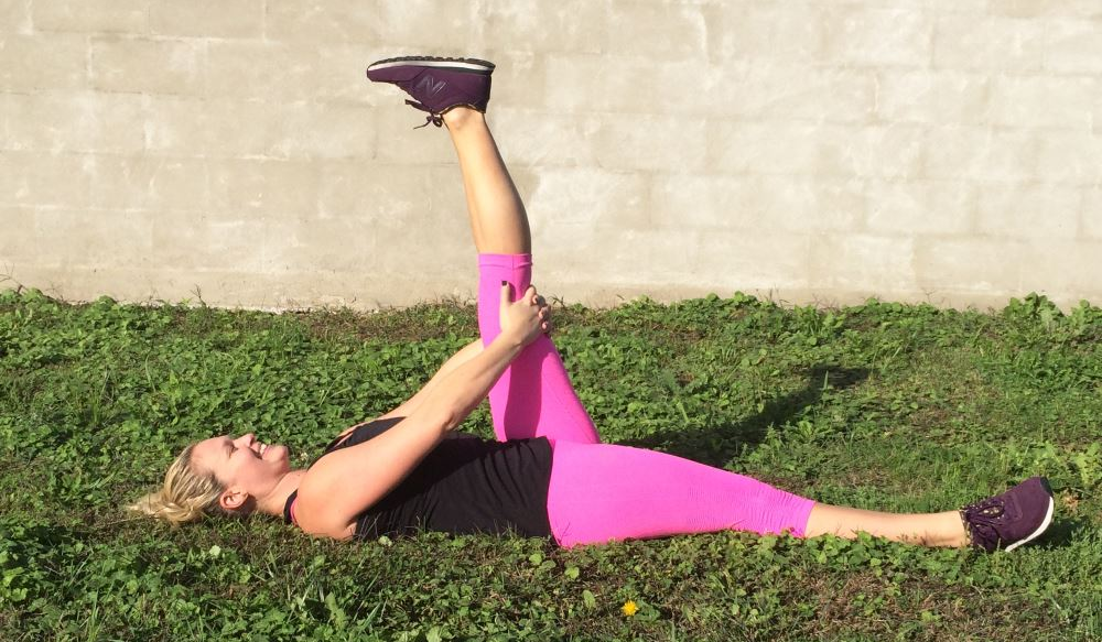 Cách thực hiện: Nằm ngửa với một chân duỗi trên sàn và chân kia hướng lên trần nhà. 2 tay nắm lấy phía sau chân nhấc lên và bắt đầu nhẹ nhàng kéo chân về gần thân. Bàn chân càng gập vuông góc thì giãn càng sâu. Nếu bạn cảm thấy căng và không thoải mái, hơi gập chân đang nhấc hoặc hướng mũi chân về trần nhà. Đảm bảo cơ cổ thoải mái và xương sống nhấn xuống sàn. Đổi chân bên kia.