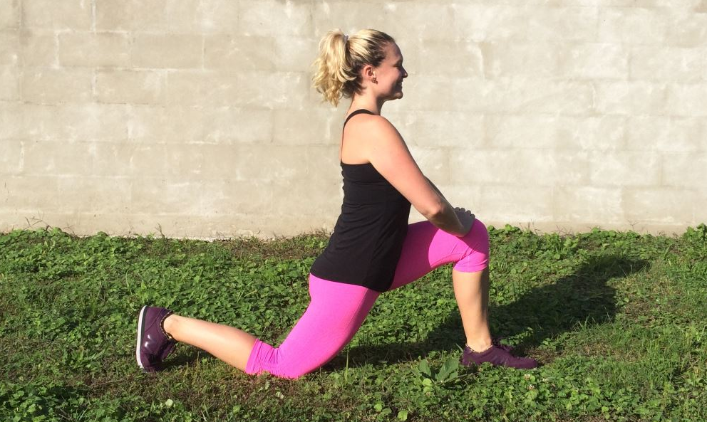 Cách thực hiện: Ngay sau khi giãn bắp chân, cẩn thận đưa đầu gối phía sau đặt lên mặt sàn, hông hướng về trước và giữ cột sống thẳng. Giữ cơ bụng hóp vào, cơ lưng sẽ không bị kéo giãn quá đà, đặt tay lên đầu gối chân trước. Giữ đầu gối thẳng phía trên mắt cá chân. Giữ tại đây và lặp lại bên kia.
