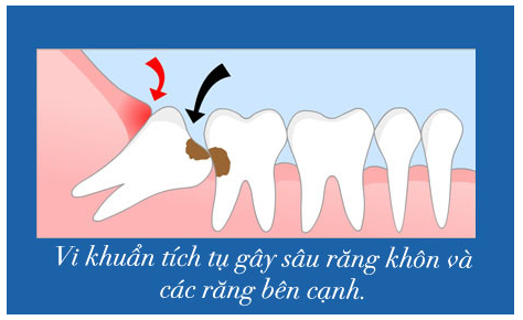 - Răng khôn khi mọc qua lợi sẽ tạo ra một vạt lợi phát triển quanh chân răng. Đây có thể là nơi thức ăn và vi khuẩn đọng lại, gây sưng, đỏ và đau lợi.