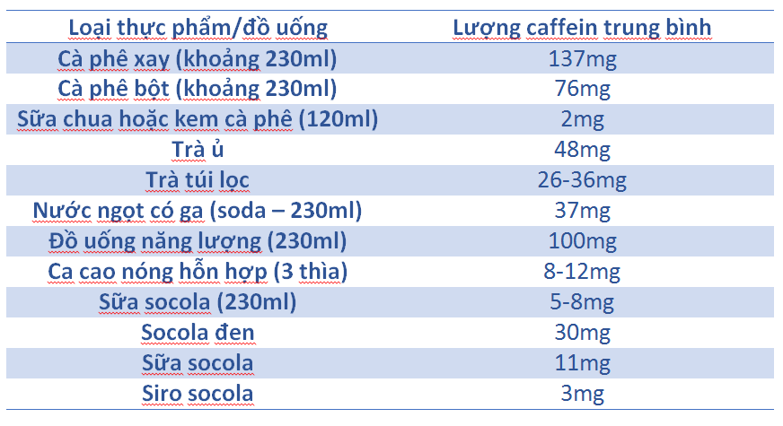 Danh sách dưới đây cho thấy lượng caffeine trong thực phẩm và đồ uống thông thường. Lượng caffeine chỉ là con số trung bình, vì vậy chúng có thể thay đổi tùy thuộc vào thương hiệu hoặc thức ăn hoặc thức uống.