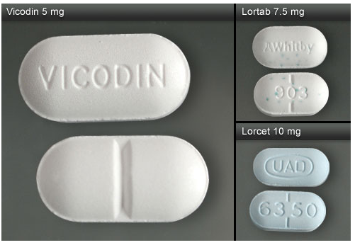 Những thuốc này có chứa opioid hydrocodon và acetaminophen. Những thuốc opioid có thể gây ngủ và táo bón. Ở liều cao, thuốc có thể gây những vấn đề hô hấp nguy hiểm. Vicodin còn được gọi với các tên gọi bao gồm “vike” và “Watson-387”.