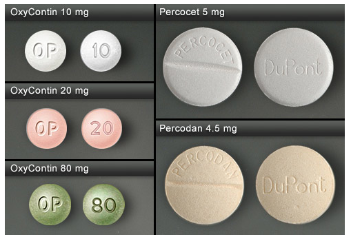 Một thuốc giảm đau khác thuộc nhóm opioid là oxycodon, bao gồm các biệt dược OxyCotin, Percocet, Percodan, và Roxicodone. Những người nghiện oxycodon có thể nghiền nát nó và hít hoặc tiêm chích, làm tăng đáng kể nguy cơ quá liều. Tên đường phố bao gồm "oxy", "O.C." và "oxycotton" cho OxyContin và "percs" cho Percocet hoặc Percodan.