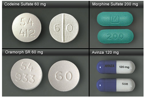 Một số thuốc kê đơn gây nghiện thường gặp là những thuốc giảm đau, đặc biệt là nhóm opioid. Những thuốc này có tác dụng giảm đau tốt nhưng nếu được sử dụng với một liều lượng lớn có thể gây hưng phấn ở mức độ cao và nhiều tác dụng phụ nguy hiểm khác. Các bác sĩ thường kê morphin để giảm đau nặng và codein để giảm đau nhẹ hoặc giảm ho. Một số biệt dược của morphin như Avinza, Kadian và MS Contin.